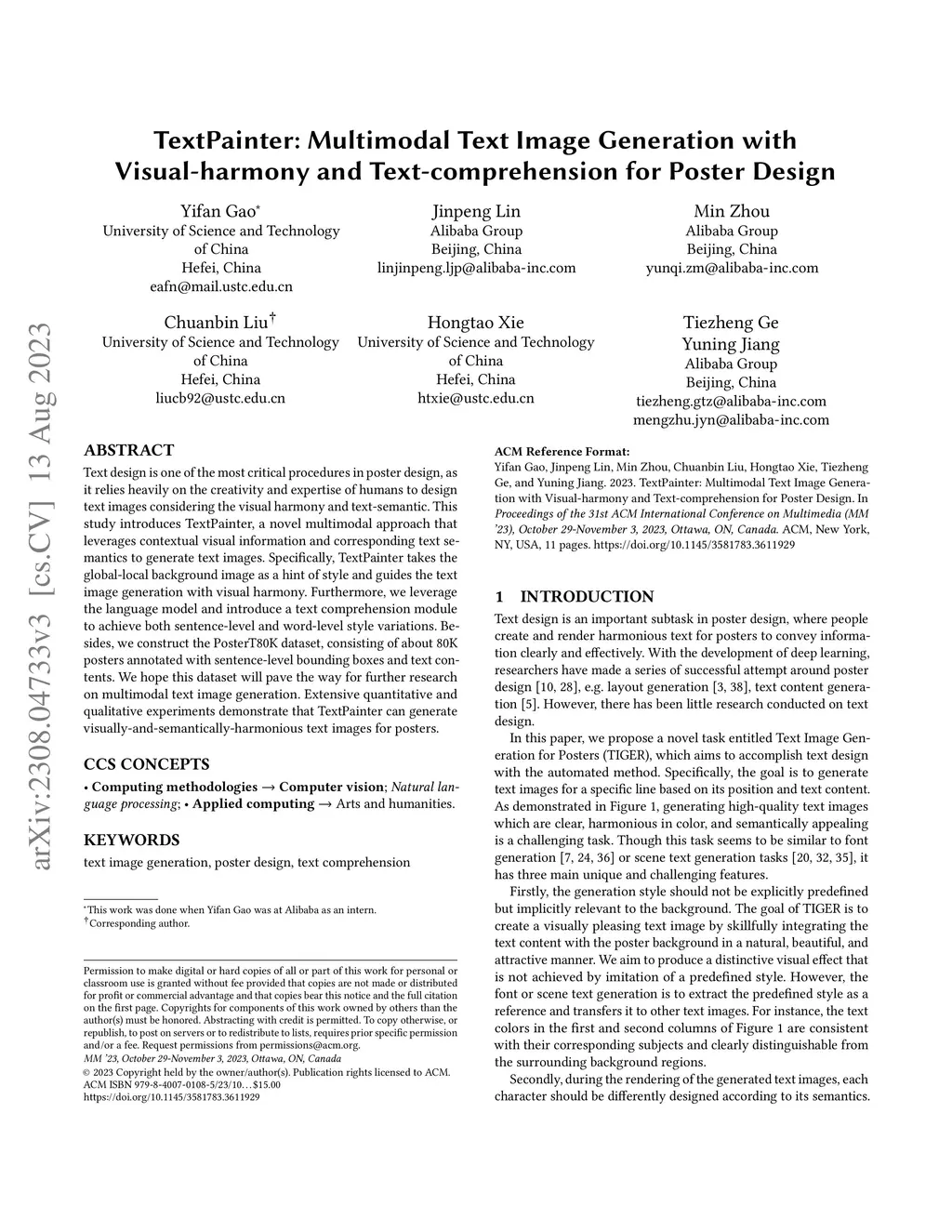 Text design is one of the most critical procedures in poster design, as it relies heavily on the creativity and expertise of humans to design text images considering the visual harmony and text-semantic. This study introduces TextPainter, a novel multimodal approach that leverages contextual visual information and corresponding text semantics to generate text images. Specifically, TextPainter takes the global-local background image as a hint of style and guides the text image generation with visual harmony. Furthermore, we leverage the language model and introduce a text comprehension module to achieve both sentence-level and word-level style variations. Besides, we construct the PosterT80K dataset, consisting of about 80K posters annotated with sentence-level bounding boxes and text contents. We hope this dataset will pave the way for further research on multimodal text image generation. Extensive quantitative and qualitative experiments demonstrate that TextPainter can generate visually-and-semantically-harmonious text images for posters.