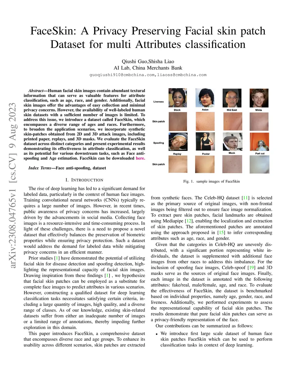 Human facial skin images contain abundant textural information that can serve as valuable features for attribute classification, such as age, race, and gender. Additionally, facial skin images offer the advantages of easy collection and minimal privacy concerns. However, the availability of well-labeled human skin datasets with a sufficient number of images is limited. To address this issue, we introduce a dataset called FaceSkin, which encompasses a diverse range of ages and races. Furthermore, to broaden the application scenarios, we incorporate synthetic skin-patches obtained from 2D and 3D attack images, including printed paper, replays, and 3D masks. We evaluate the FaceSkin dataset across distinct categories and present experimental results demonstrating its effectiveness in attribute classification, as well as its potential for various downstream tasks, such as Face anti-spoofing and Age estimation.