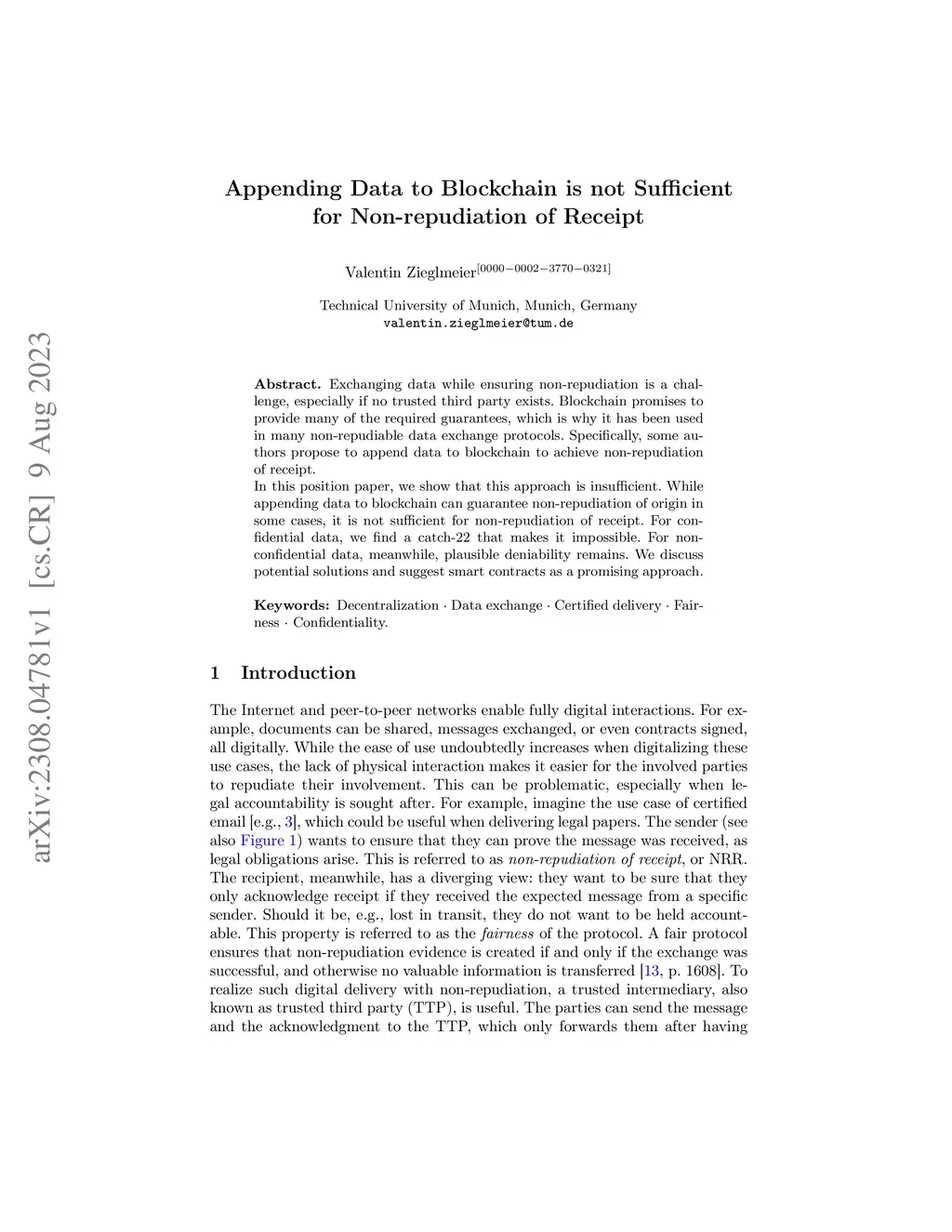 Exchanging data while ensuring non-repudiation is a challenge, especially if no trusted third party exists. Blockchain promises to provide many of the required guarantees, which is why it has been used in many non-repudiable data exchange protocols. Specifically, some authors propose to append data to blockchain to achieve non-repudiation of receipt. In this position paper, we show that this approach is insufficient. While appending data to blockchain can guarantee non-repudiation of origin in some cases, it is not sufficient for non-repudiation of receipt. For confidential data, we find a catch-22 that makes it impossible. For non-confidential data, meanwhile, plausible deniability remains. We discuss potential solutions and suggest smart contracts as a promising approach.