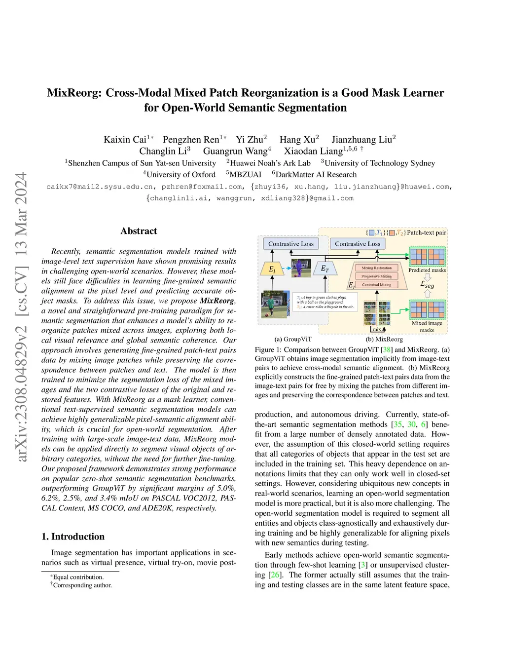 Recently, semantic segmentation models trained with image-level text supervision have shown promising results in challenging open-world scenarios. However, these models still face difficulties in learning fine-grained semantic alignment at the pixel level and predicting accurate object masks. To address this issue, we propose MixReorg, a novel and straightforward pre-training paradigm for semantic segmentation that enhances a model's ability to reorganize patches mixed across images, exploring both local visual relevance and global semantic coherence. Our approach involves generating fine-grained patch-text pairs data by mixing image patches while preserving the correspondence between patches and text. The model is then trained to minimize the segmentation loss of the mixed images and the two contrastive losses of the original and restored features. With MixReorg as a mask learner, conventional text-supervised semantic segmentation models can achieve highly generalizable pixel-semantic alignment ability, which is crucial for open-world segmentation. After training with large-scale image-text data, MixReorg models can be applied directly to segment visual objects of arbitrary categories, without the need for further fine-tuning. Our proposed framework demonstrates strong performance on popular zero-shot semantic segmentation benchmarks, outperforming GroupViT by significant margins of 5.0%, 6.2%, 2.5%, and 3.4% mIoU on PASCAL VOC2012, PASCAL Context, MS COCO, and ADE20K, respectively.