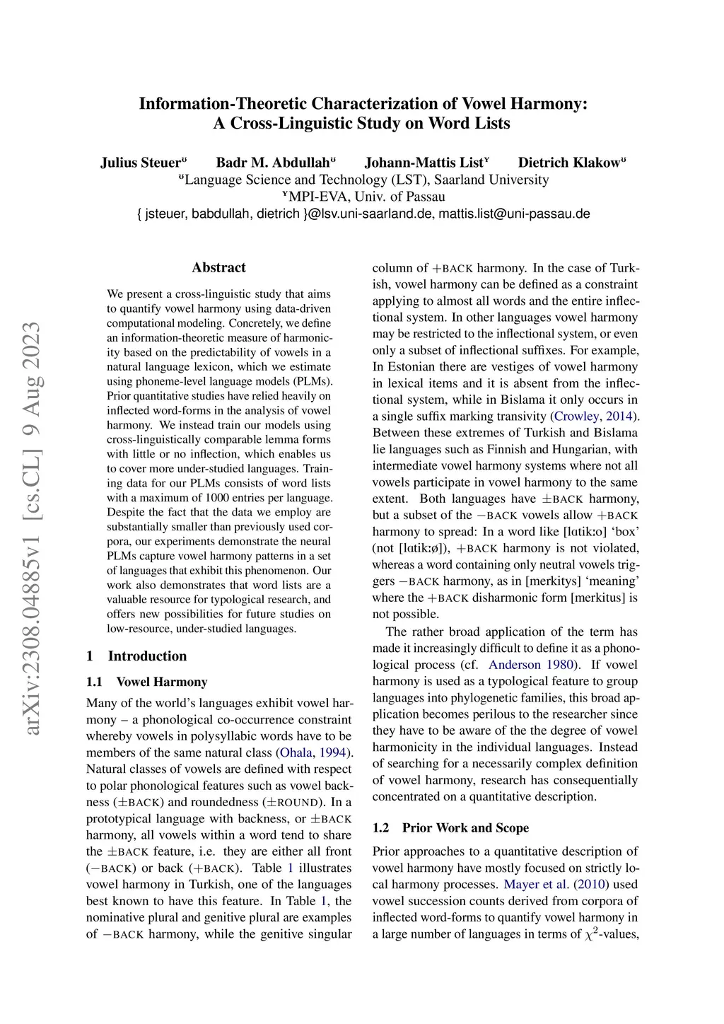 We present a cross-linguistic study that aims to quantify vowel harmony using data-driven computational modeling. Concretely, we define an information-theoretic measure of harmonicity based on the predictability of vowels in a natural language lexicon, which we estimate using phoneme-level language models (PLMs). Prior quantitative studies have relied heavily on inflected word-forms in the analysis of vowel harmony. We instead train our models using cross-linguistically comparable lemma forms with little or no inflection, which enables us to cover more under-studied languages. Training data for our PLMs consists of word lists with a maximum of 1000 entries per language. Despite the fact that the data we employ are substantially smaller than previously used corpora, our experiments demonstrate the neural PLMs capture vowel harmony patterns in a set of languages that exhibit this phenomenon. Our work also demonstrates that word lists are a valuable resource for typological research, and offers new possibilities for future studies on low-resource, under-studied languages.