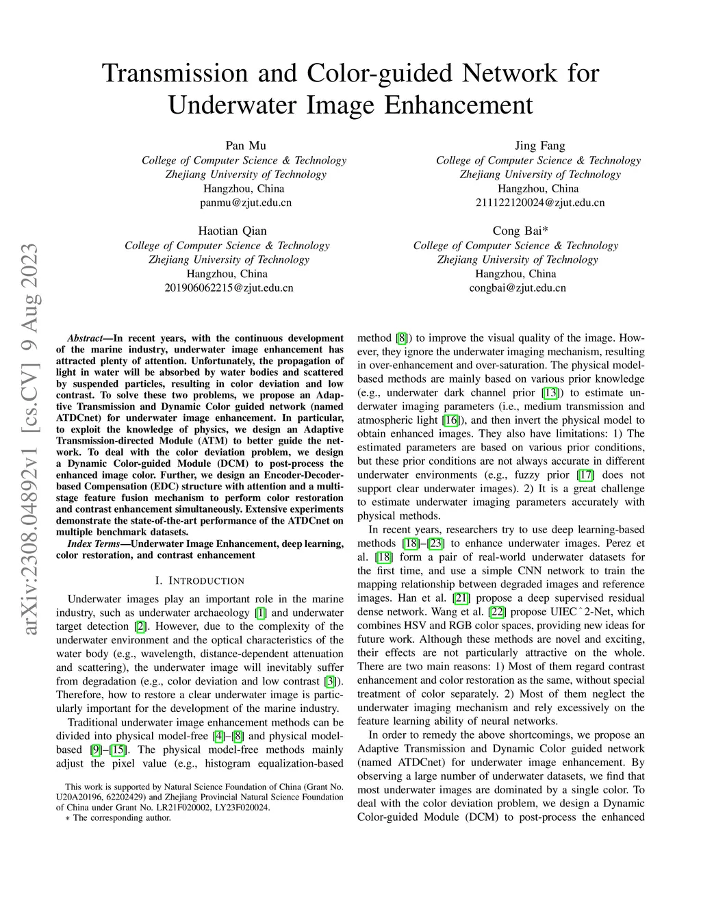 In recent years, with the continuous development of the marine industry, underwater image enhancement has attracted plenty of attention. Unfortunately, the propagation of light in water will be absorbed by water bodies and scattered by suspended particles, resulting in color deviation and low contrast. To solve these two problems, we propose an Adaptive Transmission and Dynamic Color guided network (named ATDCnet) for underwater image enhancement. In particular, to exploit the knowledge of physics, we design an Adaptive Transmission-directed Module (ATM) to better guide the network. To deal with the color deviation problem, we design a Dynamic Color-guided Module (DCM) to post-process the enhanced image color. Further, we design an Encoder-Decoder-based Compensation (EDC) structure with attention and a multi-stage feature fusion mechanism to perform color restoration and contrast enhancement simultaneously. Extensive experiments demonstrate the state-of-the-art performance of the ATDCnet on multiple benchmark datasets.