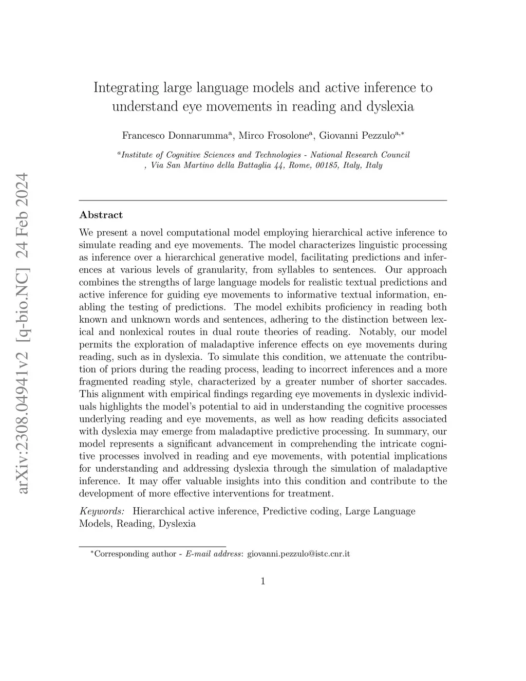 We present a novel computational model employing hierarchical active inference to simulate reading and eye movements. The model characterizes linguistic processing as inference over a hierarchical generative model, facilitating predictions and inferences at various levels of granularity, from syllables to sentences. Our approach combines the strengths of large language models for realistic textual predictions and active inference for guiding eye movements to informative textual information, enabling the testing of predictions. The model exhibits proficiency in reading both known and unknown words and sentences, adhering to the distinction between lexical and nonlexical routes in dual-route theories of reading. Notably, our model permits the exploration of maladaptive inference effects on eye movements during reading, such as in dyslexia. To simulate this condition, we attenuate the contribution of priors during the reading process, leading to incorrect inferences and a more fragmented reading style, characterized by a greater number of shorter saccades. This alignment with empirical findings regarding eye movements in dyslexic individuals highlights the model's potential to aid in understanding the cognitive processes underlying reading and eye movements, as well as how reading deficits associated with dyslexia may emerge from maladaptive predictive processing. In summary, our model represents a significant advancement in comprehending the intricate cognitive processes involved in reading and eye movements, with potential implications for understanding and addressing dyslexia through the simulation of maladaptive inference. It may offer valuable insights into this condition and contribute to the development of more effective interventions for treatment.