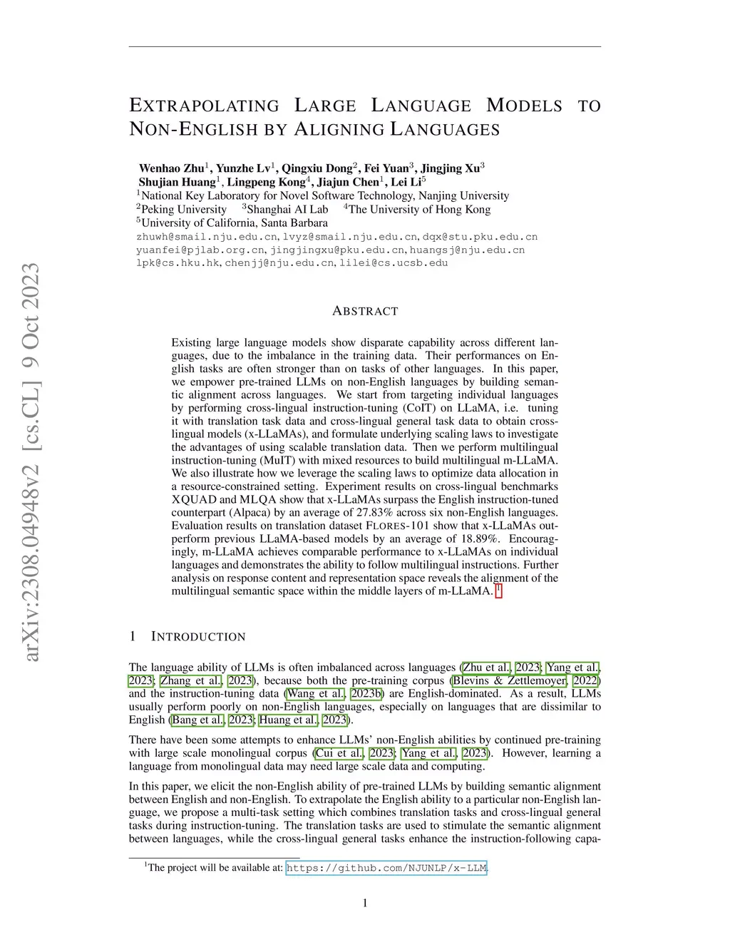 Existing large language models show disparate capability across different languages, due to the imbalance in the training data. Their performances on English tasks are often stronger than on tasks of other languages. In this paper, we empower pre-trained LLMs on non-English languages by building semantic alignment across languages. We start from targeting individual languages by performing cross-lingual instruction-tuning (CoIT) on LLaMA, i.e. tuning it with translation task data and cross-lingual general task data to obtain cross-lingual models (x-LLaMAs), and formulate underlying scaling laws to investigate the advantages of using scalable translation data. Then we perform multilingual instruction-tuning (MuIT) with mixed resources to build multilingual m-LLaMA. We also illustrate how we leverage the scaling laws to optimize data allocation in a resource-constrained setting. Experiment results on cross-lingual benchmarks XQUAD and MLQA show that x-LLaMAs surpass the English instruction-tuned counterpart (Alpaca) by an average of 27.83% across six non-English languages. Evaluation results on translation dataset Flores-101 show that x-LLaMAs outperform previous LLaMA-based models by an average of 18.89%. Encouragingly, m-LLaMA achieves comparable performance to x-LLaMAs on individual languages and demonstrates the ability to follow multilingual instructions. Further analysis on response content and representation space reveals the alignment of the multilingual semantic space within the middle layers of m-LLaMA.