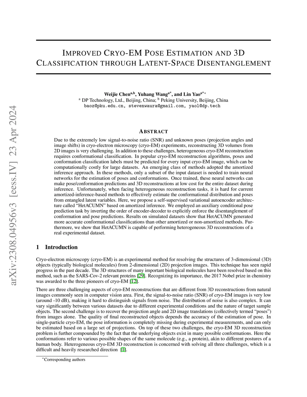 Due to the extremely low signal-to-noise ratio (SNR) and unknown poses (projection angles and image translation) in cryo-EM experiments, reconstructing 3D structures from 2D images is very challenging. On top of these challenges, heterogeneous cryo-EM reconstruction also has an additional requirement: conformation classification. An emerging solution to this problem is called amortized inference, implemented using the autoencoder architecture or its variants. Instead of searching for the correct image-to-pose/conformation mapping for every image in the dataset as in non-amortized methods, amortized inference only needs to train an encoder that maps images to appropriate latent spaces representing poses or conformations. Unfortunately, standard amortized-inference-based methods with entangled latent spaces have difficulty learning the distribution of conformations and poses from cryo-EM images. In this paper, we propose an unsupervised deep learning architecture called "ACE-HetEM" based on amortized inference. To explicitly enforce the disentanglement of conformation classifications and pose estimations, we designed two alternating training tasks in our method: image-to-image task and pose-to-pose task. Results on simulated datasets show that ACE-HetEM has comparable accuracy in pose estimation and produces even better reconstruction resolution than non-amortized methods. Furthermore, we show that ACE-HetEM is also applicable to real experimental datasets.