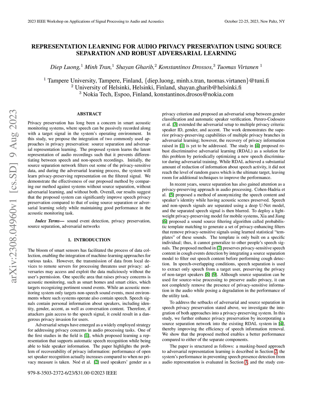 Privacy preservation has long been a concern in smart acoustic monitoring systems, where speech can be passively recorded along with a target signal in the system's operating environment. In this study, we propose the integration of two commonly used approaches in privacy preservation: source separation and adversarial representation learning. The proposed system learns the latent representation of audio recordings such that it prevents differentiating between speech and non-speech recordings. Initially, the source separation network filters out some of the privacy-sensitive data, and during the adversarial learning process, the system will learn privacy-preserving representation on the filtered signal. We demonstrate the effectiveness of our proposed method by comparing our method against systems without source separation, without adversarial learning, and without both. Overall, our results suggest that the proposed system can significantly improve speech privacy preservation compared to that of using source separation or adversarial learning solely while maintaining good performance in the acoustic monitoring task.