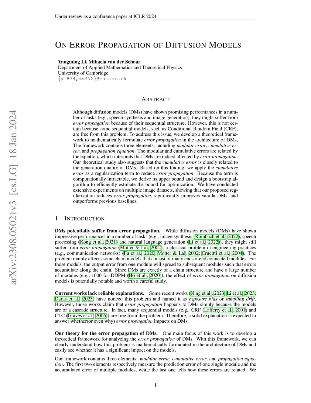 Although diffusion models (DMs) have shown promising performances in a number of tasks (e.g., speech synthesis and image generation), they might suffer from error propagation because of their sequential structure. However, this is not certain because some sequential models, such as Conditional Random Field (CRF), are free from this problem. To address this issue, we develop a theoretical framework to mathematically formulate error propagation in the architecture of DMs, The framework contains three elements, including modular error, cumulative error, and propagation equation. The modular and cumulative errors are related by the equation, which interprets that DMs are indeed affected by error propagation. Our theoretical study also suggests that the cumulative error is closely related to the generation quality of DMs. Based on this finding, we apply the cumulative error as a regularization term to reduce error propagation. Because the term is computationally intractable, we derive its upper bound and design a bootstrap algorithm to efficiently estimate the bound for optimization. We have conducted extensive experiments on multiple image datasets, showing that our proposed regularization reduces error propagation, significantly improves vanilla DMs, and outperforms previous baselines.