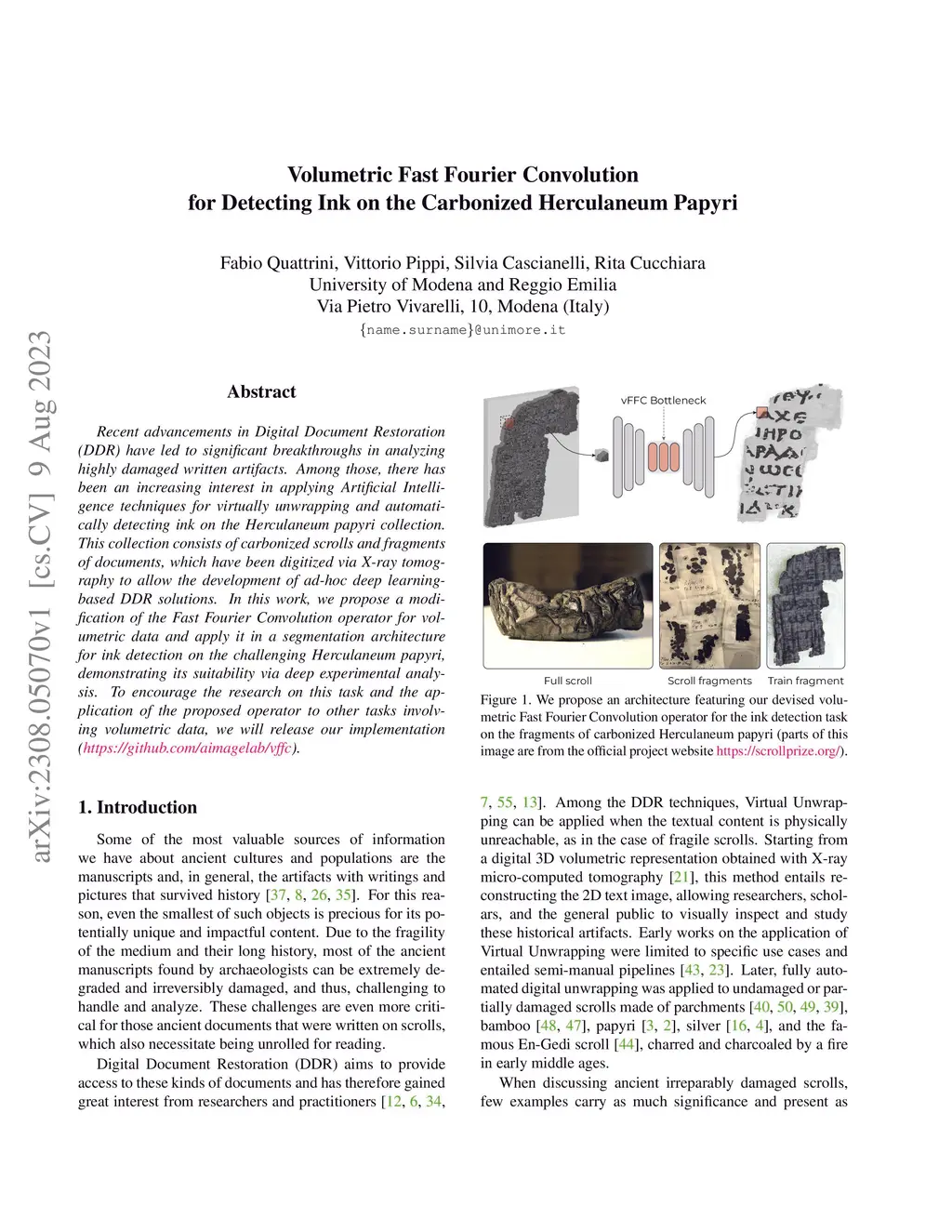 Recent advancements in Digital Document Restoration (DDR) have led to significant breakthroughs in analyzing highly damaged written artifacts. Among those, there has been an increasing interest in applying Artificial Intelligence techniques for virtually unwrapping and automatically detecting ink on the Herculaneum papyri collection. This collection consists of carbonized scrolls and fragments of documents, which have been digitized via X-ray tomography to allow the development of ad-hoc deep learning-based DDR solutions. In this work, we propose a modification of the Fast Fourier Convolution operator for volumetric data and apply it in a segmentation architecture for ink detection on the challenging Herculaneum papyri, demonstrating its suitability via deep experimental analysis. To encourage the research on this task and the application of the proposed operator to other tasks involving volumetric data, we will release our implementation (https://github.com/aimagelab/vffc)