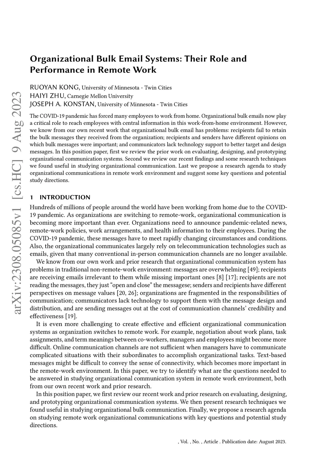 The COVID-19 pandemic has forced many employees to work from home. Organizational bulk emails now play a critical role to reach employees with central information in this work-from-home environment. However, we know from our own recent work that organizational bulk email has problems: recipients fail to retain the bulk messages they received from the organization; recipients and senders have different opinions on which bulk messages were important; and communicators lack technology support to better target and design messages. In this position paper, first we review the prior work on evaluating, designing, and prototyping organizational communication systems. Second we review our recent findings and some research techniques we found useful in studying organizational communication. Last we propose a research agenda to study organizational communications in remote work environment and suggest some key questions and potential study directions.