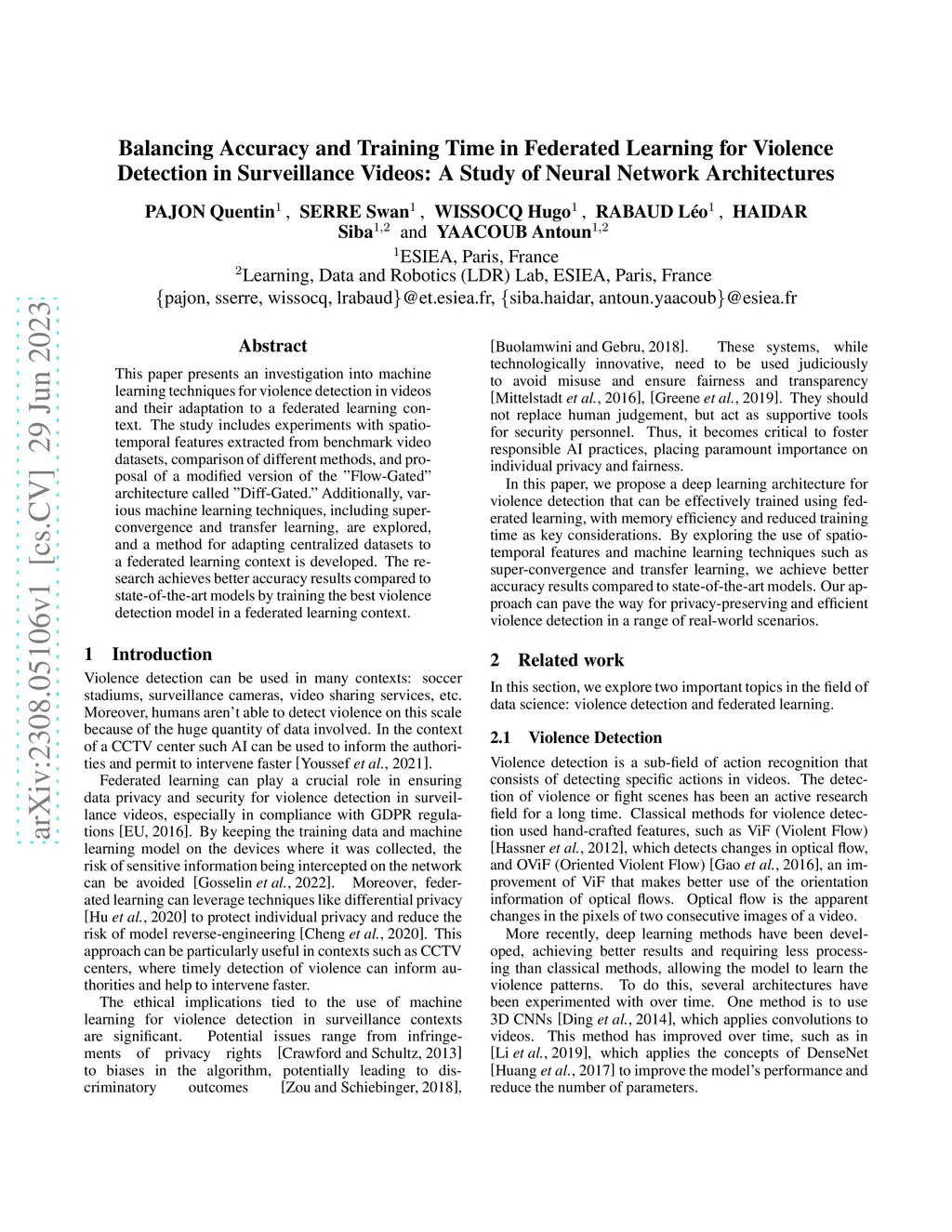 This paper presents an investigation into machine learning techniques for violence detection in videos and their adaptation to a federated learning context. The study includes experiments with spatio-temporal features extracted from benchmark video datasets, comparison of different methods, and proposal of a modified version of the "Flow-Gated" architecture called "Diff-Gated." Additionally, various machine learning techniques, including super-convergence and transfer learning, are explored, and a method for adapting centralized datasets to a federated learning context is developed. The research achieves better accuracy results compared to state-of-the-art models by training the best violence detection model in a federated learning context.