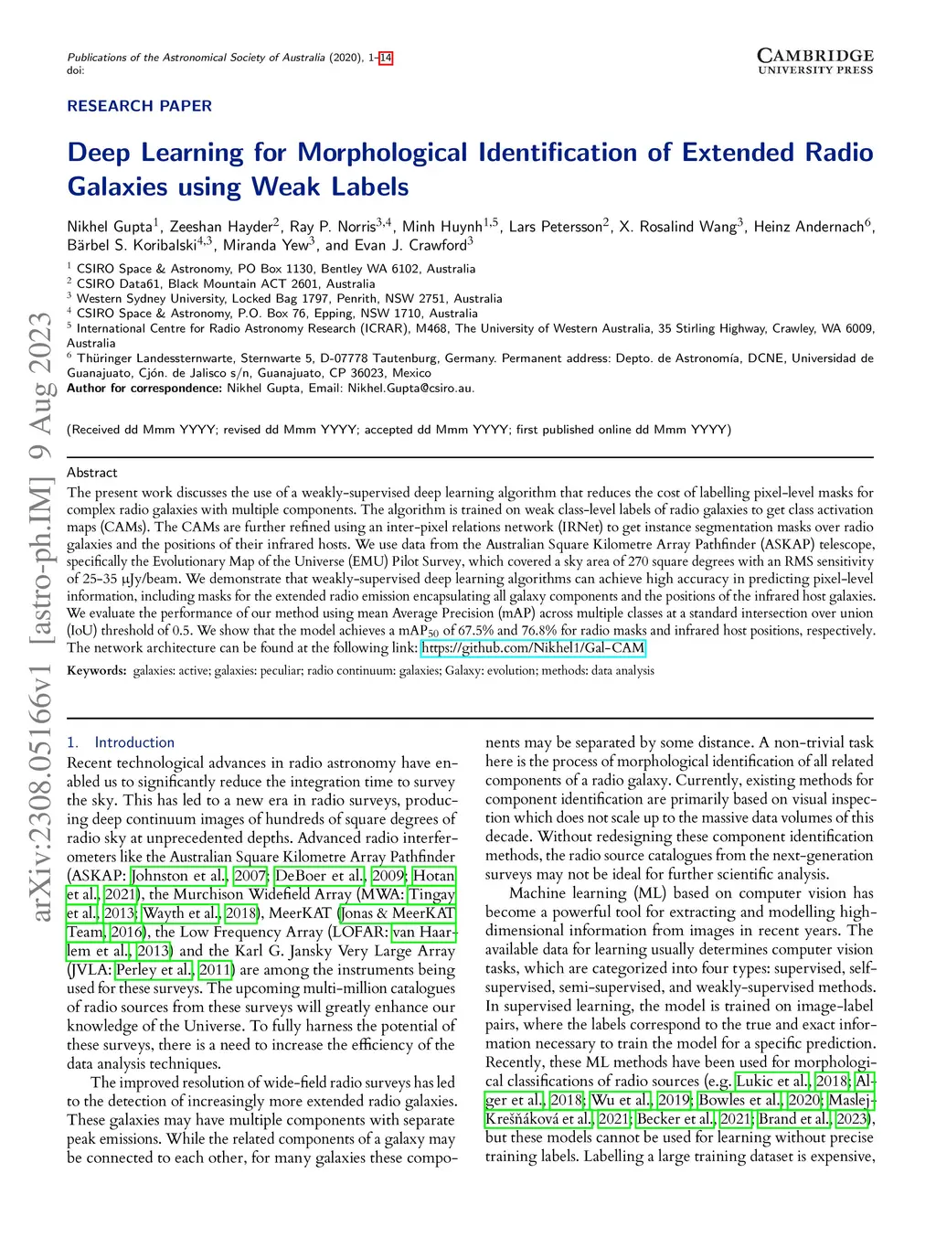 The present work discusses the use of a weakly-supervised deep learning algorithm that reduces the cost of labelling pixel-level masks for complex radio galaxies with multiple components. The algorithm is trained on weak class-level labels of radio galaxies to get class activation maps (CAMs). The CAMs are further refined using an inter-pixel relations network (IRNet) to get instance segmentation masks over radio galaxies and the positions of their infrared hosts. We use data from the Australian Square Kilometre Array Pathfinder (ASKAP) telescope, specifically the Evolutionary Map of the Universe (EMU) Pilot Survey, which covered a sky area of 270 square degrees with an RMS sensitivity of 25-35 Jy/beam. We demonstrate that weakly-supervised deep learning algorithms can achieve high accuracy in predicting pixel-level information, including masks for the extended radio emission encapsulating all galaxy components and the positions of the infrared host galaxies. We evaluate the performance of our method using mean Average Precision (mAP) across multiple classes at a standard intersection over union (IoU) threshold of 0.5. We show that the model achieves a mAP of 67.5\% and 76.8\% for radio masks and infrared host positions, respectively. The network architecture can be found at the following link: https://github.com/Nikhel1/Gal-CAM
