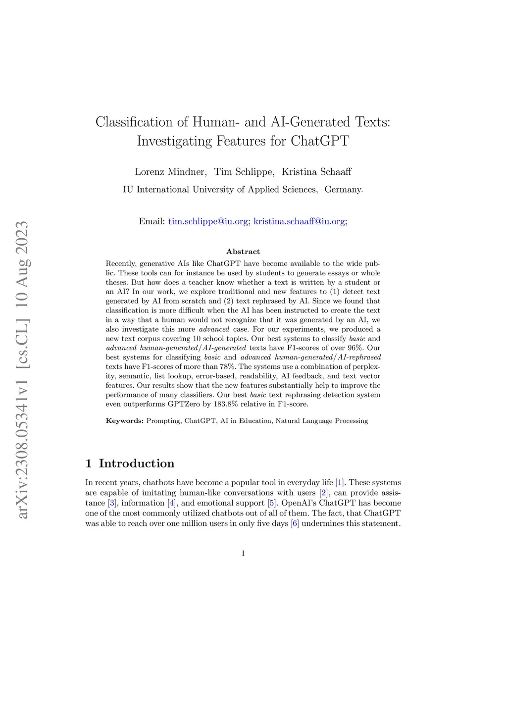 Recently, generative AIs like ChatGPT have become available to the wide public. These tools can for instance be used by students to generate essays or whole theses. But how does a teacher know whether a text is written by a student or an AI? In our work, we explore traditional and new features to (1) detect text generated by AI from scratch and (2) text rephrased by AI. Since we found that classification is more difficult when the AI has been instructed to create the text in a way that a human would not recognize that it was generated by an AI, we also investigate this more advanced case. For our experiments, we produced a new text corpus covering 10 school topics. Our best systems to classify basic and advanced human-generated/AI-generated texts have F1-scores of over 96%. Our best systems for classifying basic and advanced human-generated/AI-rephrased texts have F1-scores of more than 78%. The systems use a combination of perplexity, semantic, list lookup, error-based, readability, AI feedback, and text vector features. Our results show that the new features substantially help to improve the performance of many classifiers. Our best basic text rephrasing detection system even outperforms GPTZero by 183.8% relative in F1-score.