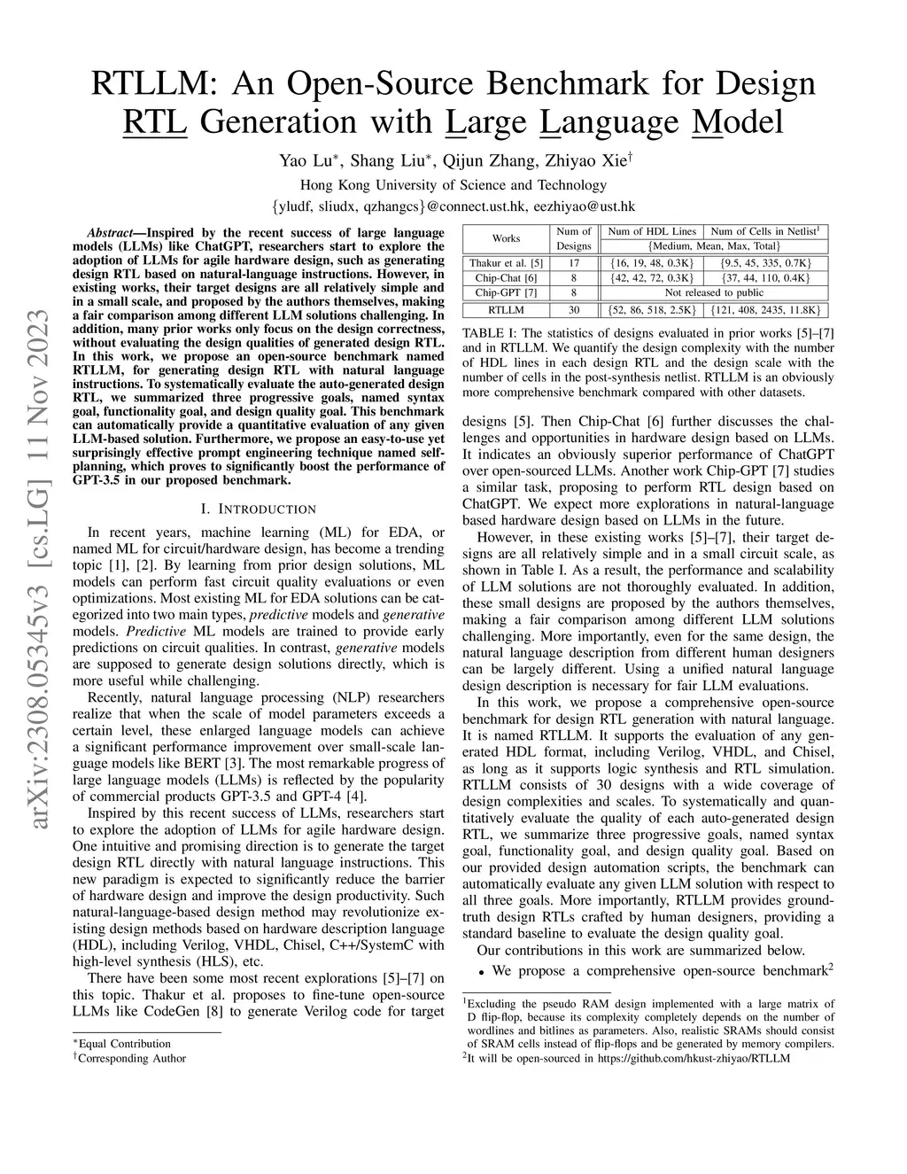 RTLLM: An Open-Source Benchmark for Design RTL Generation with Large