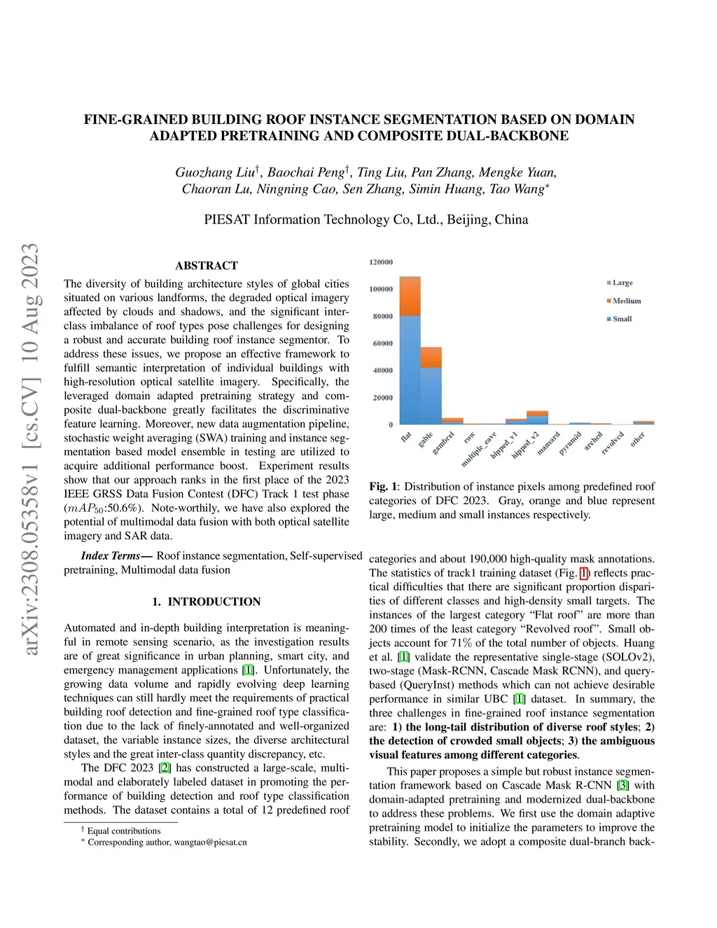 The diversity of building architecture styles of global cities situated on various landforms, the degraded optical imagery affected by clouds and shadows, and the significant inter-class imbalance of roof types pose challenges for designing a robust and accurate building roof instance segmentor. To address these issues, we propose an effective framework to fulfill semantic interpretation of individual buildings with high-resolution optical satellite imagery. Specifically, the leveraged domain adapted pretraining strategy and composite dual-backbone greatly facilitates the discriminative feature learning. Moreover, new data augmentation pipeline, stochastic weight averaging (SWA) training and instance segmentation based model ensemble in testing are utilized to acquire additional performance boost. Experiment results show that our approach ranks in the first place of the 2023 IEEE GRSS Data Fusion Contest (DFC) Track 1 test phase (:50.6\%). Note-worthily, we have also explored the potential of multimodal data fusion with both optical satellite imagery and SAR data.