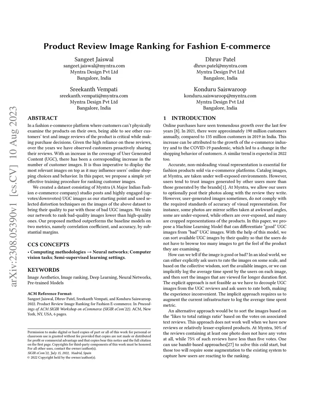 In a fashion e-commerce platform where customers can't physically examine the products on their own, being able to see other customers' text and image reviews of the product is critical while making purchase decisions. Given the high reliance on these reviews, over the years we have observed customers proactively sharing their reviews. With an increase in the coverage of User Generated Content (UGC), there has been a corresponding increase in the number of customer images. It is thus imperative to display the most relevant images on top as it may influence users' online shopping choices and behavior. In this paper, we propose a simple yet effective training procedure for ranking customer images. We created a dataset consisting of Myntra (A Major Indian Fashion e-commerce company) studio posts and highly engaged (upvotes/downvotes) UGC images as our starting point and used selected distortion techniques on the images of the above dataset to bring their quality at par with those of bad UGC images. We train our network to rank bad-quality images lower than high-quality ones. Our proposed method outperforms the baseline models on two metrics, namely correlation coefficient, and accuracy, by substantial margins.