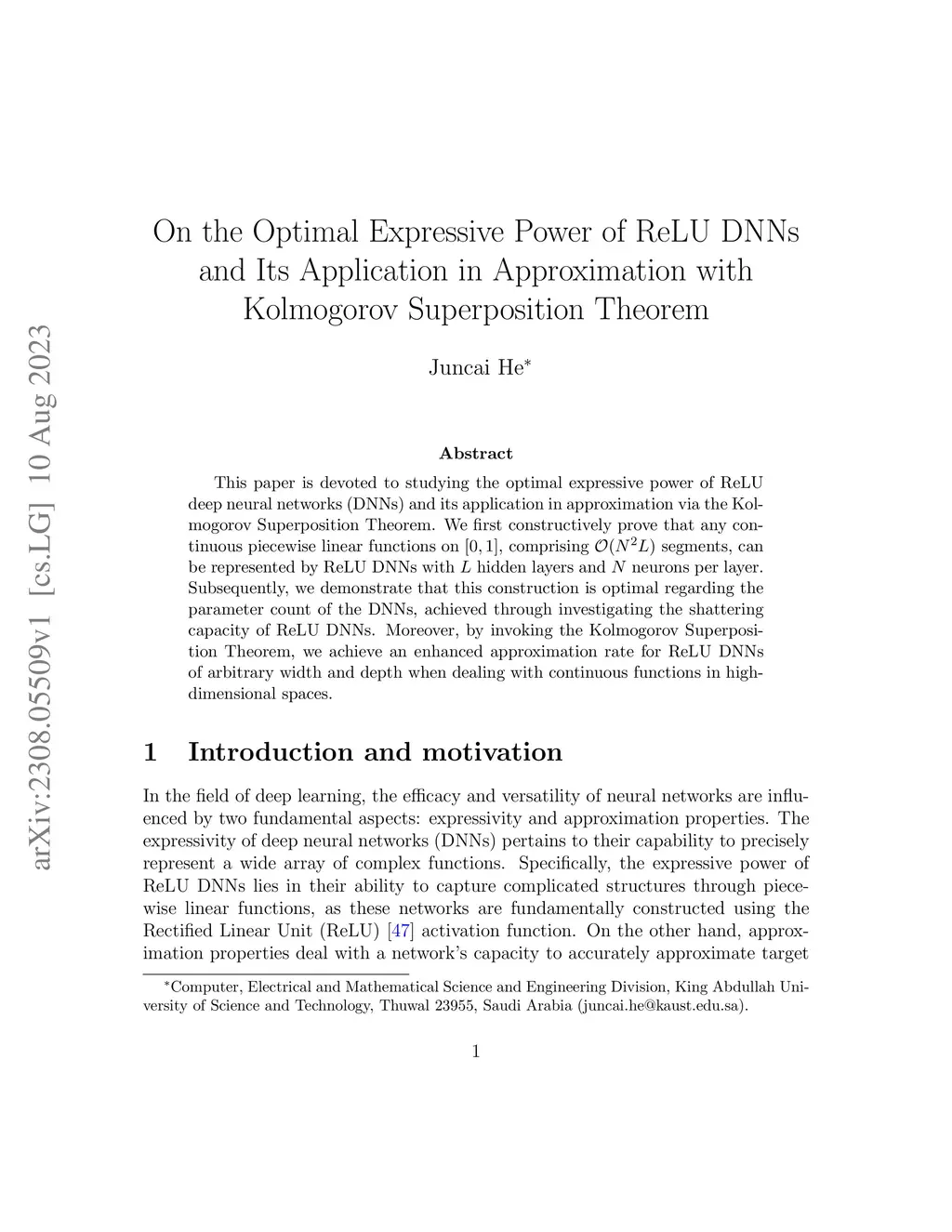 This paper is devoted to studying the optimal expressive power of ReLU deep neural networks (DNNs) and its application in approximation via the Kolmogorov Superposition Theorem. We first constructively prove that any continuous piecewise linear functions on , comprising segments, can be represented by ReLU DNNs with hidden layers and neurons per layer. Subsequently, we demonstrate that this construction is optimal regarding the parameter count of the DNNs, achieved through investigating the shattering capacity of ReLU DNNs. Moreover, by invoking the Kolmogorov Superposition Theorem, we achieve an enhanced approximation rate for ReLU DNNs of arbitrary width and depth when dealing with continuous functions in high-dimensional spaces.