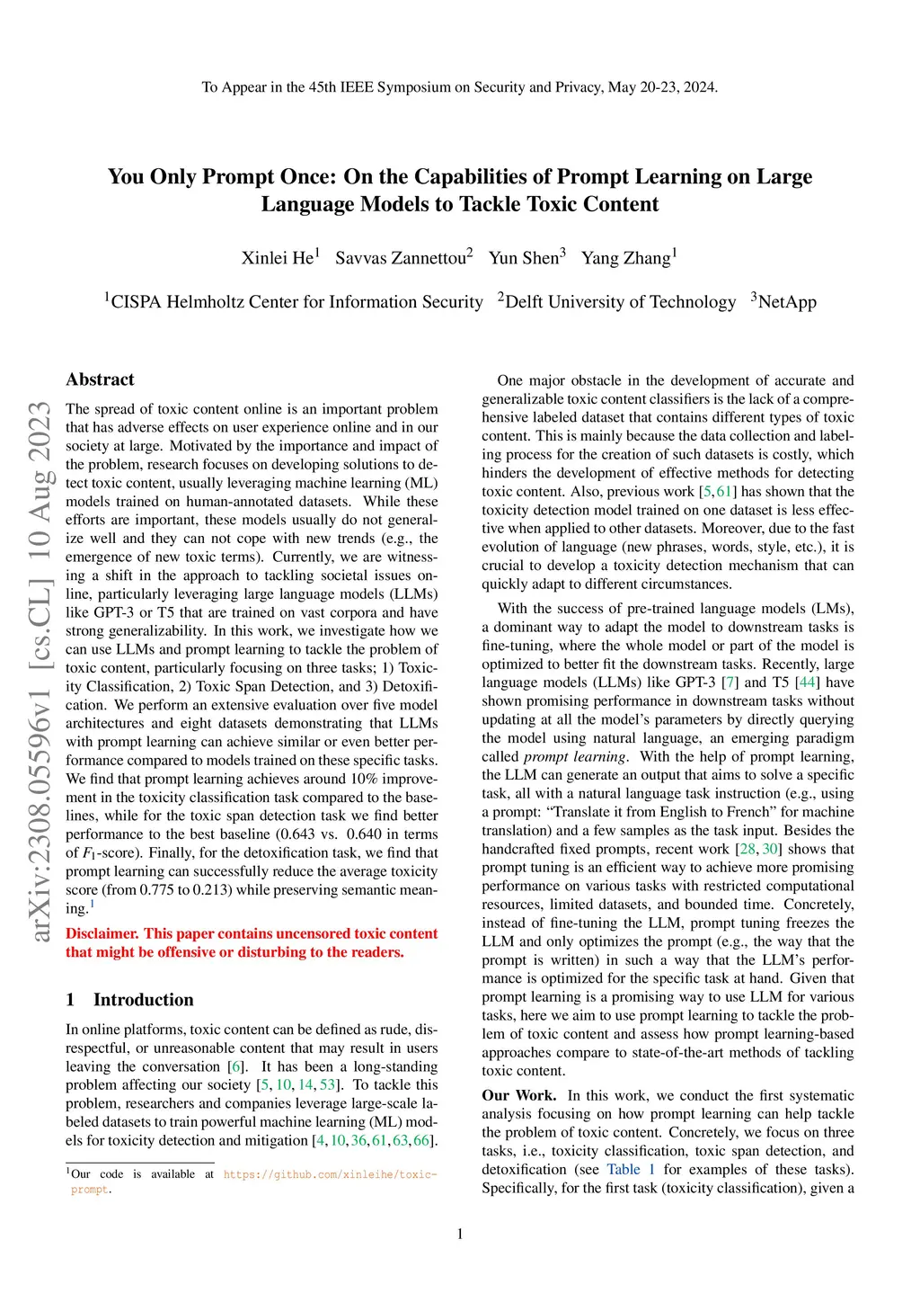 The spread of toxic content online is an important problem that has adverse effects on user experience online and in our society at large. Motivated by the importance and impact of the problem, research focuses on developing solutions to detect toxic content, usually leveraging machine learning (ML) models trained on human-annotated datasets. While these efforts are important, these models usually do not generalize well and they can not cope with new trends (e.g., the emergence of new toxic terms). Currently, we are witnessing a shift in the approach to tackling societal issues online, particularly leveraging large language models (LLMs) like GPT-3 or T5 that are trained on vast corpora and have strong generalizability. In this work, we investigate how we can use LLMs and prompt learning to tackle the problem of toxic content, particularly focusing on three tasks; 1) Toxicity Classification, 2) Toxic Span Detection, and 3) Detoxification. We perform an extensive evaluation over five model architectures and eight datasets demonstrating that LLMs with prompt learning can achieve similar or even better performance compared to models trained on these specific tasks. We find that prompt learning achieves around 10\% improvement in the toxicity classification task compared to the baselines, while for the toxic span detection task we find better performance to the best baseline (0.643 vs. 0.640 in terms of -score). Finally, for the detoxification task, we find that prompt learning can successfully reduce the average toxicity score (from 0.775 to 0.213) while preserving semantic meaning.