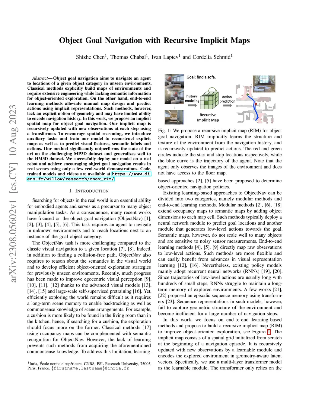 Object goal navigation aims to navigate an agent to locations of a given object category in unseen environments. Classical methods explicitly build maps of environments and require extensive engineering while lacking semantic information for object-oriented exploration. On the other hand, end-to-end learning methods alleviate manual map design and predict actions using implicit representations. Such methods, however, lack an explicit notion of geometry and may have limited ability to encode navigation history. In this work, we propose an implicit spatial map for object goal navigation. Our implicit map is recursively updated with new observations at each step using a transformer. To encourage spatial reasoning, we introduce auxiliary tasks and train our model to reconstruct explicit maps as well as to predict visual features, semantic labels and actions. Our method significantly outperforms the state of the art on the challenging MP3D dataset and generalizes well to the HM3D dataset. We successfully deploy our model on a real robot and achieve encouraging object goal navigation results in real scenes using only a few real-world demonstrations. Code, trained models and videos are available at \url{https://www.di.ens.fr/willow/research/onav_rim/}.