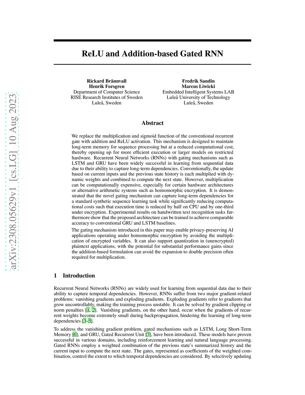 We replace the multiplication and sigmoid function of the conventional recurrent gate with addition and ReLU activation. This mechanism is designed to maintain long-term memory for sequence processing but at a reduced computational cost, thereby opening up for more efficient execution or larger models on restricted hardware. Recurrent Neural Networks (RNNs) with gating mechanisms such as LSTM and GRU have been widely successful in learning from sequential data due to their ability to capture long-term dependencies. Conventionally, the update based on current inputs and the previous state history is each multiplied with dynamic weights and combined to compute the next state. However, multiplication can be computationally expensive, especially for certain hardware architectures or alternative arithmetic systems such as homomorphic encryption. It is demonstrated that the novel gating mechanism can capture long-term dependencies for a standard synthetic sequence learning task while significantly reducing computational costs such that execution time is reduced by half on CPU and by one-third under encryption. Experimental results on handwritten text recognition tasks furthermore show that the proposed architecture can be trained to achieve comparable accuracy to conventional GRU and LSTM baselines. The gating mechanism introduced in this paper may enable privacy-preserving AI applications operating under homomorphic encryption by avoiding the multiplication of encrypted variables. It can also support quantization in (unencrypted) plaintext applications, with the potential for substantial performance gains since the addition-based formulation can avoid the expansion to double precision often required for multiplication.