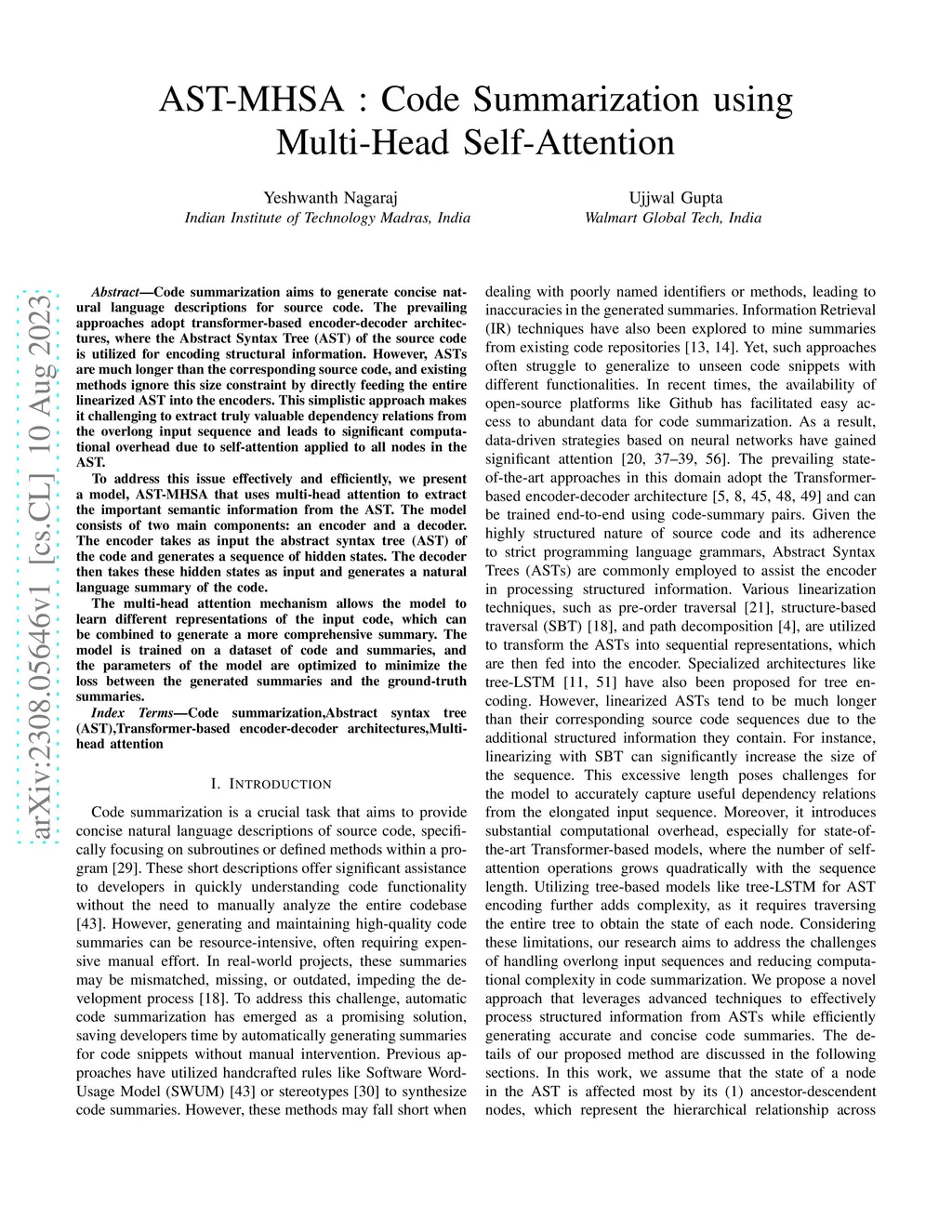 Code summarization aims to generate concise natural language descriptions for source code. The prevailing approaches adopt transformer-based encoder-decoder architectures, where the Abstract Syntax Tree (AST) of the source code is utilized for encoding structural information. However, ASTs are much longer than the corresponding source code, and existing methods ignore this size constraint by directly feeding the entire linearized AST into the encoders. This simplistic approach makes it challenging to extract truly valuable dependency relations from the overlong input sequence and leads to significant computational overhead due to self-attention applied to all nodes in the AST. To address this issue effectively and efficiently, we present a model, AST-MHSA that uses multi-head attention to extract the important semantic information from the AST. The model consists of two main components: an encoder and a decoder. The encoder takes as input the abstract syntax tree (AST) of the code and generates a sequence of hidden states. The decoder then takes these hidden states as input and generates a natural language summary of the code. The multi-head attention mechanism allows the model to learn different representations of the input code, which can be combined to generate a more comprehensive summary. The model is trained on a dataset of code and summaries, and the parameters of the model are optimized to minimize the loss between the generated summaries and the ground-truth summaries.