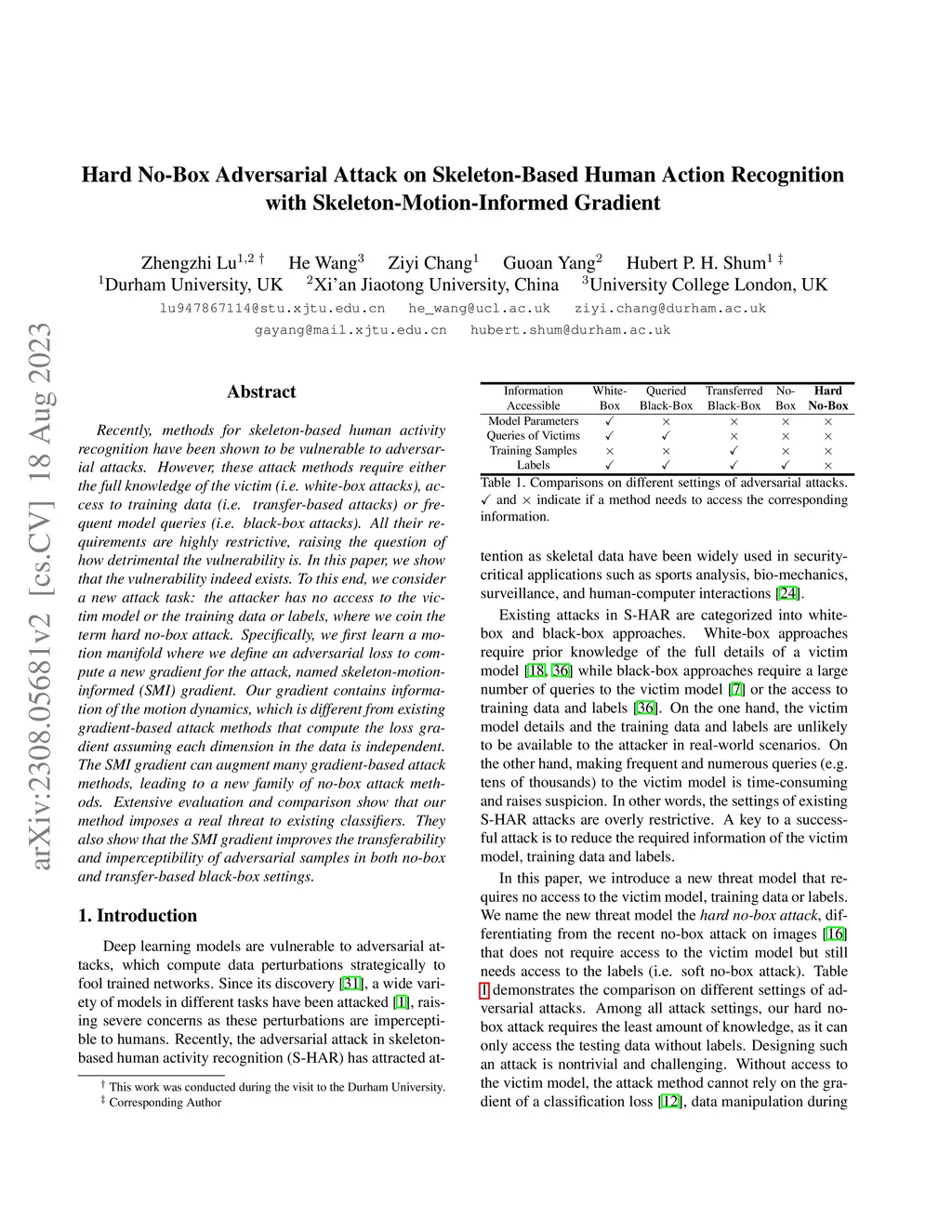 Recently, methods for skeleton-based human activity recognition have been shown to be vulnerable to adversarial attacks. However, these attack methods require either the full knowledge of the victim (i.e. white-box attacks), access to training data (i.e. transfer-based attacks) or frequent model queries (i.e. black-box attacks). All their requirements are highly restrictive, raising the question of how detrimental the vulnerability is. In this paper, we show that the vulnerability indeed exists. To this end, we consider a new attack task: the attacker has no access to the victim model or the training data or labels, where we coin the term hard no-box attack. Specifically, we first learn a motion manifold where we define an adversarial loss to compute a new gradient for the attack, named skeleton-motion-informed (SMI) gradient. Our gradient contains information of the motion dynamics, which is different from existing gradient-based attack methods that compute the loss gradient assuming each dimension in the data is independent. The SMI gradient can augment many gradient-based attack methods, leading to a new family of no-box attack methods. Extensive evaluation and comparison show that our method imposes a real threat to existing classifiers. They also show that the SMI gradient improves the transferability and imperceptibility of adversarial samples in both no-box and transfer-based black-box settings.