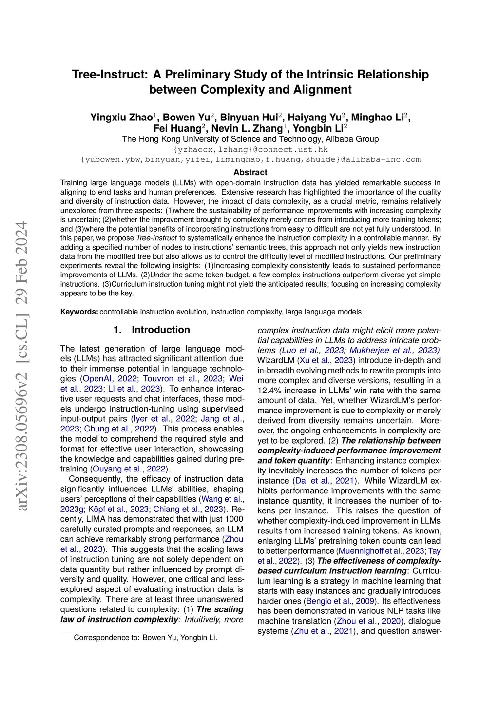 Training large language models (LLMs) with open-domain instruction data has yielded remarkable success in aligning to end tasks and user preferences. Extensive research has highlighted that enhancing the quality and diversity of instruction data consistently improves performance. However, the impact of data complexity, as a crucial metric, remains relatively unexplored in three aspects: (1) scaling law, where the sustainability of performance improvements with increasing complexity is uncertain, (2) additional tokens, whether the improvement brought by complexity comes from introducing more training tokens, and (3) curriculum tuning, where the potential advantages of incorporating instructions ranging from easy to difficult are not yet fully understood. In this paper, we propose \textit{tree-instruct} to systematically enhance the complexity of instruction data in a controllable manner. This approach adds a specified number of nodes into the instruction semantic tree, yielding new instruction data based on the modified tree. By adjusting the number of added nodes, we can control the difficulty level in the modified instruction data. Our preliminary experiments reveal the following insights: (1) Increasing complexity consistently leads to sustained performance improvements. For instance, using 1,000 instruction data and 10 nodes resulted in a substantial 24\% increase in win rate. (2) Under the same token budget, a few complex instructions outperform diverse yet simple instructions. (3) Curriculum instruction tuning might not yield the anticipated results; focusing on increasing complexity appears to be the key.