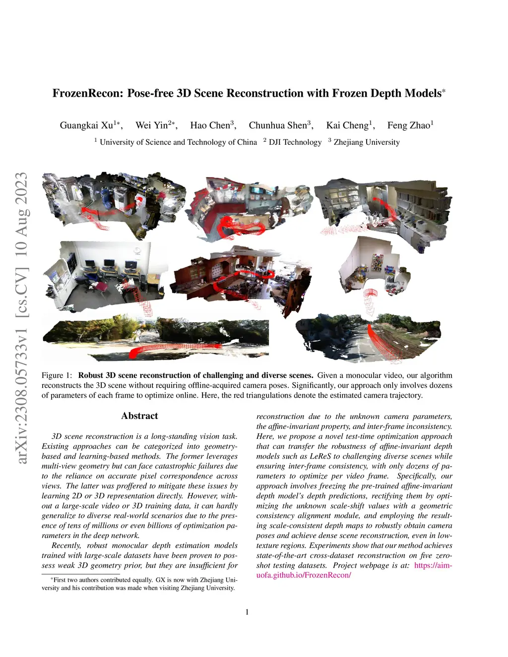 3D scene reconstruction is a long-standing vision task. Existing approaches can be categorized into geometry-based and learning-based methods. The former leverages multi-view geometry but can face catastrophic failures due to the reliance on accurate pixel correspondence across views. The latter was proffered to mitigate these issues by learning 2D or 3D representation directly. However, without a large-scale video or 3D training data, it can hardly generalize to diverse real-world scenarios due to the presence of tens of millions or even billions of optimization parameters in the deep network. Recently, robust monocular depth estimation models trained with large-scale datasets have been proven to possess weak 3D geometry prior, but they are insufficient for reconstruction due to the unknown camera parameters, the affine-invariant property, and inter-frame inconsistency. Here, we propose a novel test-time optimization approach that can transfer the robustness of affine-invariant depth models such as LeReS to challenging diverse scenes while ensuring inter-frame consistency, with only dozens of parameters to optimize per video frame. Specifically, our approach involves freezing the pre-trained affine-invariant depth model's depth predictions, rectifying them by optimizing the unknown scale-shift values with a geometric consistency alignment module, and employing the resulting scale-consistent depth maps to robustly obtain camera poses and achieve dense scene reconstruction, even in low-texture regions. Experiments show that our method achieves state-of-the-art cross-dataset reconstruction on five zero-shot testing datasets.