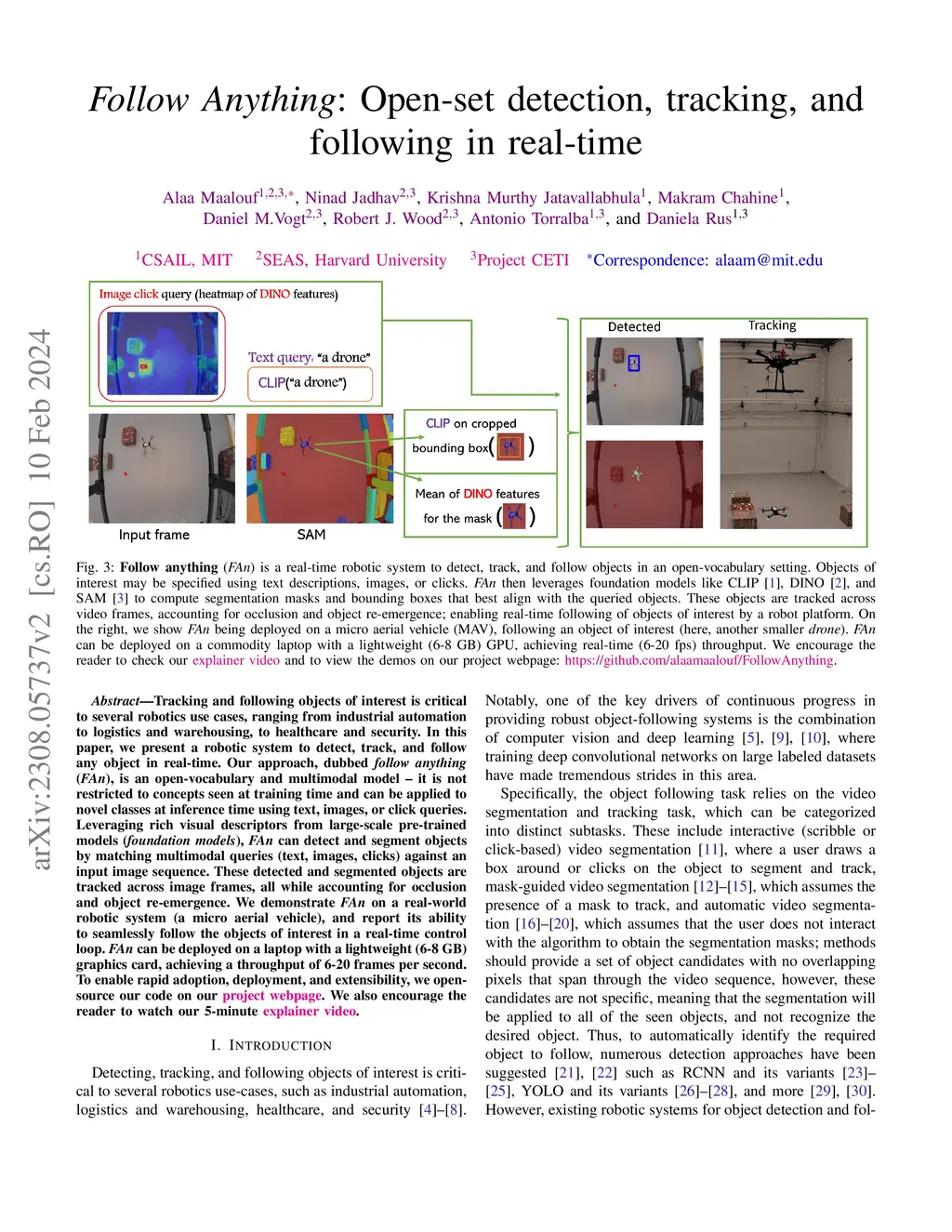 Tracking and following objects of interest is critical to several robotics use cases, ranging from industrial automation to logistics and warehousing, to healthcare and security. In this paper, we present a robotic system to detect, track, and follow any object in real-time. Our approach, dubbed ``follow anything'' (FAn), is an open-vocabulary and multimodal model -- it is not restricted to concepts seen at training time and can be applied to novel classes at inference time using text, images, or click queries. Leveraging rich visual descriptors from large-scale pre-trained models (foundation models), FAn can detect and segment objects by matching multimodal queries (text, images, clicks) against an input image sequence. These detected and segmented objects are tracked across image frames, all while accounting for occlusion and object re-emergence. We demonstrate FAn on a real-world robotic system (a micro aerial vehicle) and report its ability to seamlessly follow the objects of interest in a real-time control loop. FAn can be deployed on a laptop with a lightweight (6-8 GB) graphics card, achieving a throughput of 6-20 frames per second. To enable rapid adoption, deployment, and extensibility, we open-source all our code on our project webpage at https://github.com/alaamaalouf/FollowAnything . We also encourage the reader to watch our 5-minutes explainer video in this https://www.youtube.com/watch?v=6Mgt3EPytrw .