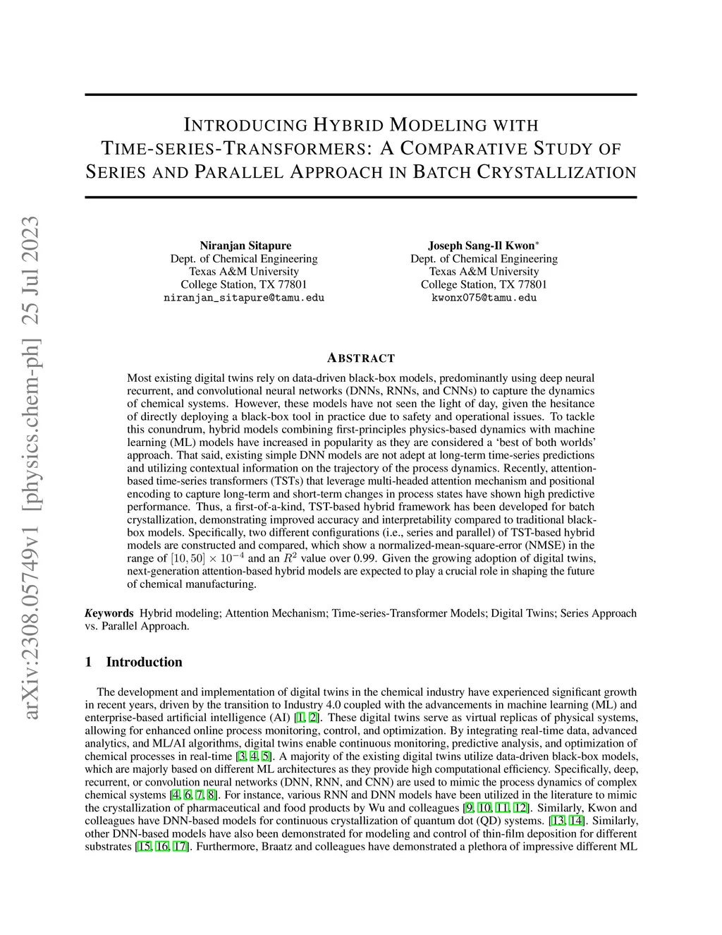 Most existing digital twins rely on data-driven black-box models, predominantly using deep neural recurrent, and convolutional neural networks (DNNs, RNNs, and CNNs) to capture the dynamics of chemical systems. However, these models have not seen the light of day, given the hesitance of directly deploying a black-box tool in practice due to safety and operational issues. To tackle this conundrum, hybrid models combining first-principles physics-based dynamics with machine learning (ML) models have increased in popularity as they are considered a 'best of both worlds' approach. That said, existing simple DNN models are not adept at long-term time-series predictions and utilizing contextual information on the trajectory of the process dynamics. Recently, attention-based time-series transformers (TSTs) that leverage multi-headed attention mechanism and positional encoding to capture long-term and short-term changes in process states have shown high predictive performance. Thus, a first-of-a-kind, TST-based hybrid framework has been developed for batch crystallization, demonstrating improved accuracy and interpretability compared to traditional black-box models. Specifically, two different configurations (i.e., series and parallel) of TST-based hybrid models are constructed and compared, which show a normalized-mean-square-error (NMSE) in the range of and an value over 0.99. Given the growing adoption of digital twins, next-generation attention-based hybrid models are expected to play a crucial role in shaping the future of chemical manufacturing.