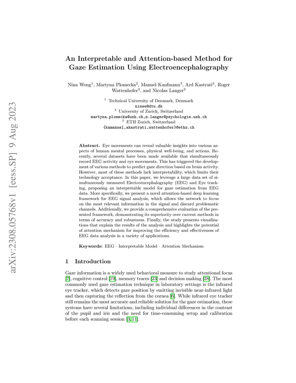 Eye movements can reveal valuable insights into various aspects of human mental processes, physical well-being, and actions. Recently, several datasets have been made available that simultaneously record EEG activity and eye movements. This has triggered the development of various methods to predict gaze direction based on brain activity. However, most of these methods lack interpretability, which limits their technology acceptance. In this paper, we leverage a large data set of simultaneously measured Electroencephalography (EEG) and Eye tracking, proposing an interpretable model for gaze estimation from EEG data. More specifically, we present a novel attention-based deep learning framework for EEG signal analysis, which allows the network to focus on the most relevant information in the signal and discard problematic channels. Additionally, we provide a comprehensive evaluation of the presented framework, demonstrating its superiority over current methods in terms of accuracy and robustness. Finally, the study presents visualizations that explain the results of the analysis and highlights the potential of attention mechanism for improving the efficiency and effectiveness of EEG data analysis in a variety of applications.