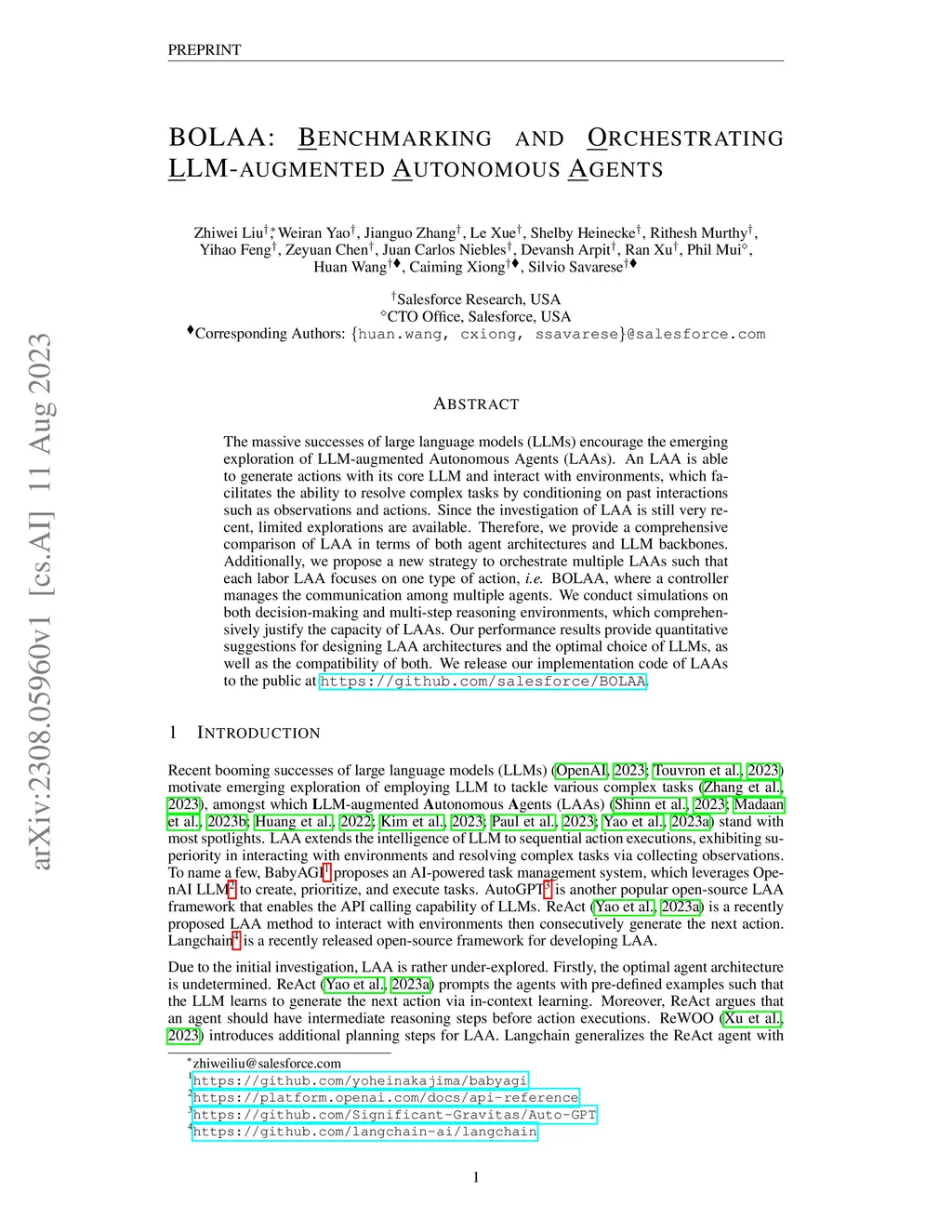 The massive successes of large language models (LLMs) encourage the emerging exploration of LLM-augmented Autonomous Agents (LAAs). An LAA is able to generate actions with its core LLM and interact with environments, which facilitates the ability to resolve complex tasks by conditioning on past interactions such as observations and actions. Since the investigation of LAA is still very recent, limited explorations are available. Therefore, we provide a comprehensive comparison of LAA in terms of both agent architectures and LLM backbones. Additionally, we propose a new strategy to orchestrate multiple LAAs such that each labor LAA focuses on one type of action, \textit{i.e.} BOLAA, where a controller manages the communication among multiple agents. We conduct simulations on both decision-making and multi-step reasoning environments, which comprehensively justify the capacity of LAAs. Our performance results provide quantitative suggestions for designing LAA architectures and the optimal choice of LLMs, as well as the compatibility of both. We release our implementation code of LAAs to the public at \url{https://github.com/salesforce/BOLAA}.