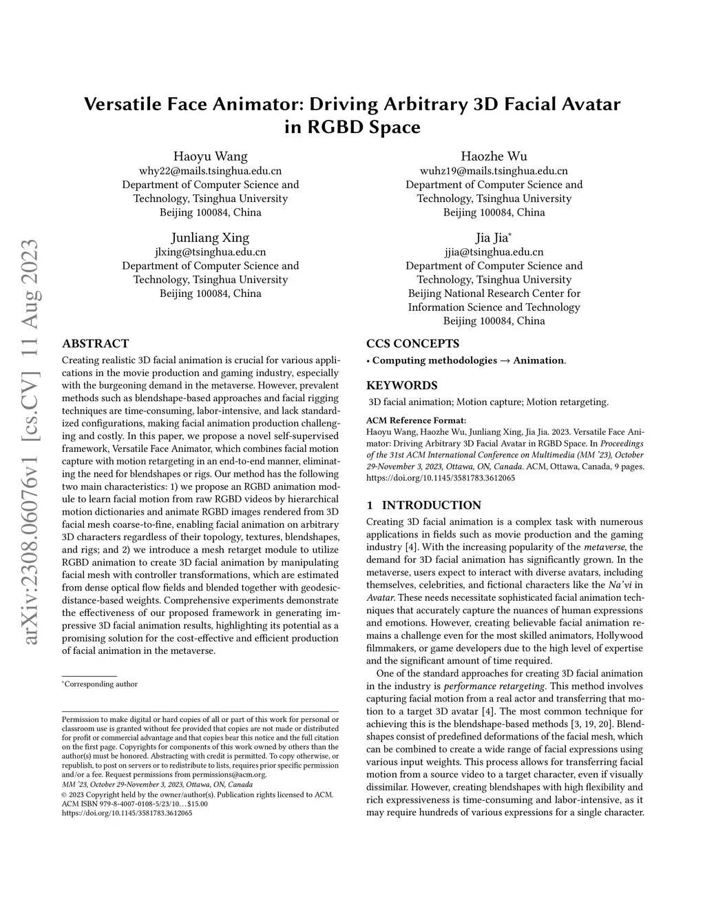 Creating realistic 3D facial animation is crucial for various applications in the movie production and gaming industry, especially with the burgeoning demand in the metaverse. However, prevalent methods such as blendshape-based approaches and facial rigging techniques are time-consuming, labor-intensive, and lack standardized configurations, making facial animation production challenging and costly. In this paper, we propose a novel self-supervised framework, Versatile Face Animator, which combines facial motion capture with motion retargeting in an end-to-end manner, eliminating the need for blendshapes or rigs. Our method has the following two main characteristics: 1) we propose an RGBD animation module to learn facial motion from raw RGBD videos by hierarchical motion dictionaries and animate RGBD images rendered from 3D facial mesh coarse-to-fine, enabling facial animation on arbitrary 3D characters regardless of their topology, textures, blendshapes, and rigs; and 2) we introduce a mesh retarget module to utilize RGBD animation to create 3D facial animation by manipulating facial mesh with controller transformations, which are estimated from dense optical flow fields and blended together with geodesic-distance-based weights. Comprehensive experiments demonstrate the effectiveness of our proposed framework in generating impressive 3D facial animation results, highlighting its potential as a promising solution for the cost-effective and efficient production of facial animation in the metaverse.
