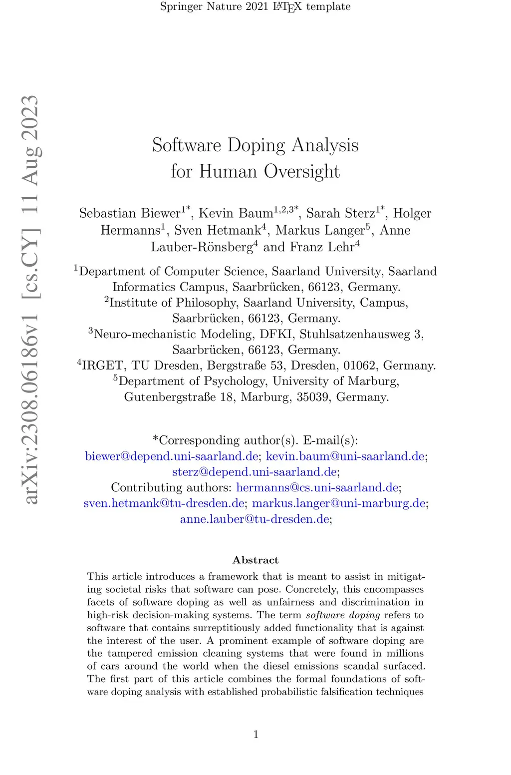 This article introduces a framework that is meant to assist in mitigating societal risks that software can pose. Concretely, this encompasses facets of software doping as well as unfairness and discrimination in high-risk decision-making systems. The term software doping refers to software that contains surreptitiously added functionality that is against the interest of the user. A prominent example of software doping are the tampered emission cleaning systems that were found in millions of cars around the world when the diesel emissions scandal surfaced. The first part of this article combines the formal foundations of software doping analysis with established probabilistic falsification techniques to arrive at a black-box analysis technique for identifying undesired effects of software. We apply this technique to emission cleaning systems in diesel cars but also to high-risk systems that evaluate humans in a possibly unfair or discriminating way. We demonstrate how our approach can assist humans-in-the-loop to make better informed and more responsible decisions. This is to promote effective human oversight, which will be a central requirement enforced by the European Union's upcoming AI Act. We complement our technical contribution with a juridically, philosophically, and psychologically informed perspective on the potential problems caused by such systems.