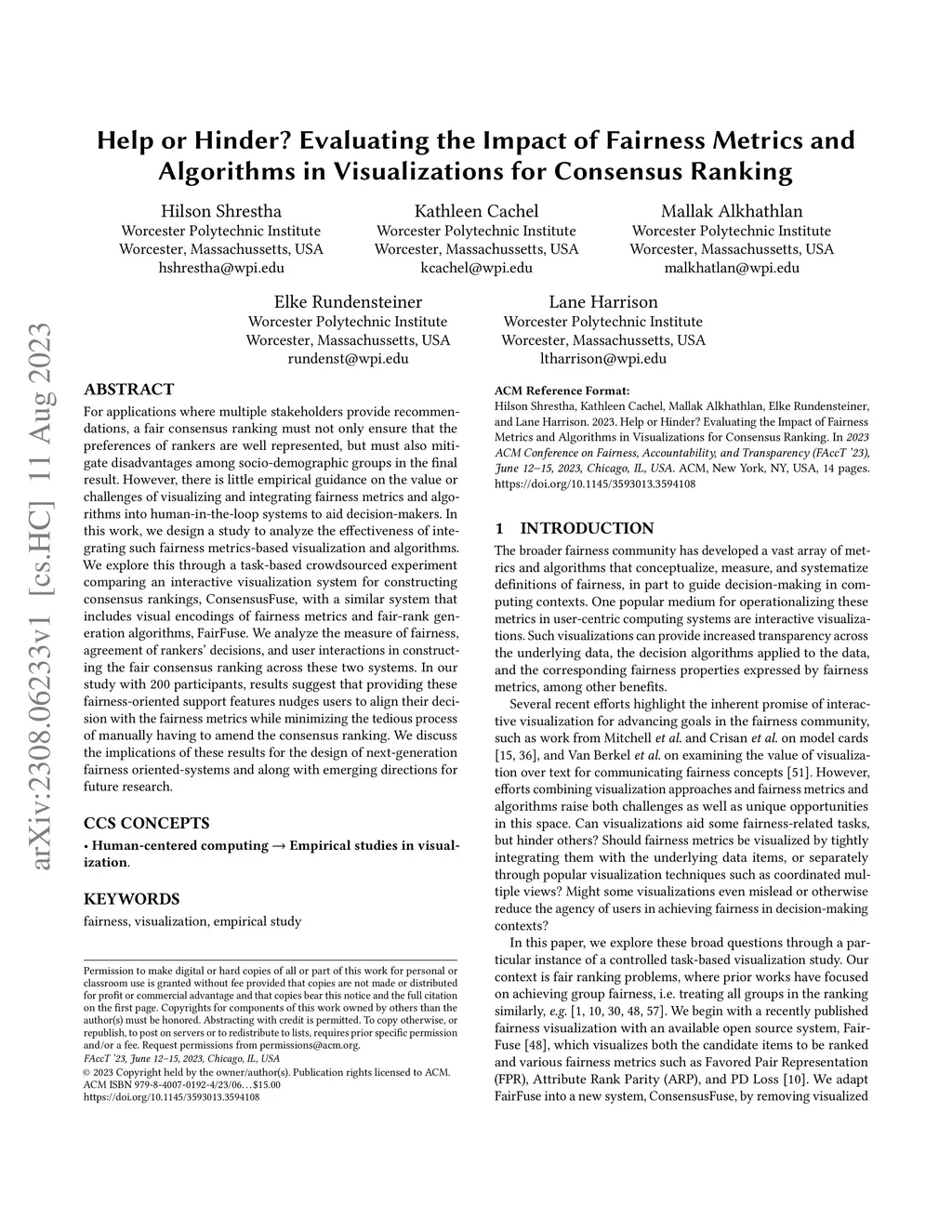 For applications where multiple stakeholders provide recommendations, a fair consensus ranking must not only ensure that the preferences of rankers are well represented, but must also mitigate disadvantages among socio-demographic groups in the final result. However, there is little empirical guidance on the value or challenges of visualizing and integrating fairness metrics and algorithms into human-in-the-loop systems to aid decision-makers. In this work, we design a study to analyze the effectiveness of integrating such fairness metrics-based visualization and algorithms. We explore this through a task-based crowdsourced experiment comparing an interactive visualization system for constructing consensus rankings, ConsensusFuse, with a similar system that includes visual encodings of fairness metrics and fair-rank generation algorithms, FairFuse. We analyze the measure of fairness, agreement of rankers' decisions, and user interactions in constructing the fair consensus ranking across these two systems. In our study with 200 participants, results suggest that providing these fairness-oriented support features nudges users to align their decision with the fairness metrics while minimizing the tedious process of manually having to amend the consensus ranking. We discuss the implications of these results for the design of next-generation fairness oriented-systems and along with emerging directions for future research.