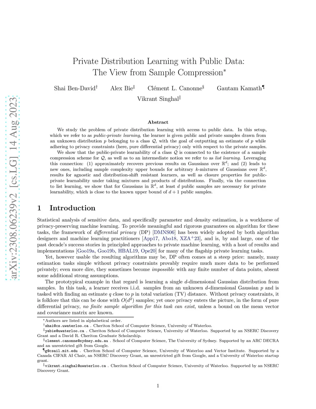 We study the problem of private distribution learning with access to public data. In this setup, which we refer to as public-private learning, the learner is given public and private samples drawn from an unknown distribution belonging to a class , with the goal of outputting an estimate of while adhering to privacy constraints (here, pure differential privacy) only with respect to the private samples. We show that the public-private learnability of a class is connected to the existence of a sample compression scheme for , as well as to an intermediate notion we refer to as list learning. Leveraging this connection: (1) approximately recovers previous results on Gaussians over ; and (2) leads to new ones, including sample complexity upper bounds for arbitrary -mixtures of Gaussians over , results for agnostic and distribution-shift resistant learners, as well as closure properties for public-private learnability under taking mixtures and products of distributions. Finally, via the connection to list learning, we show that for Gaussians in , at least public samples are necessary for private learnability, which is close to the known upper bound of public samples.