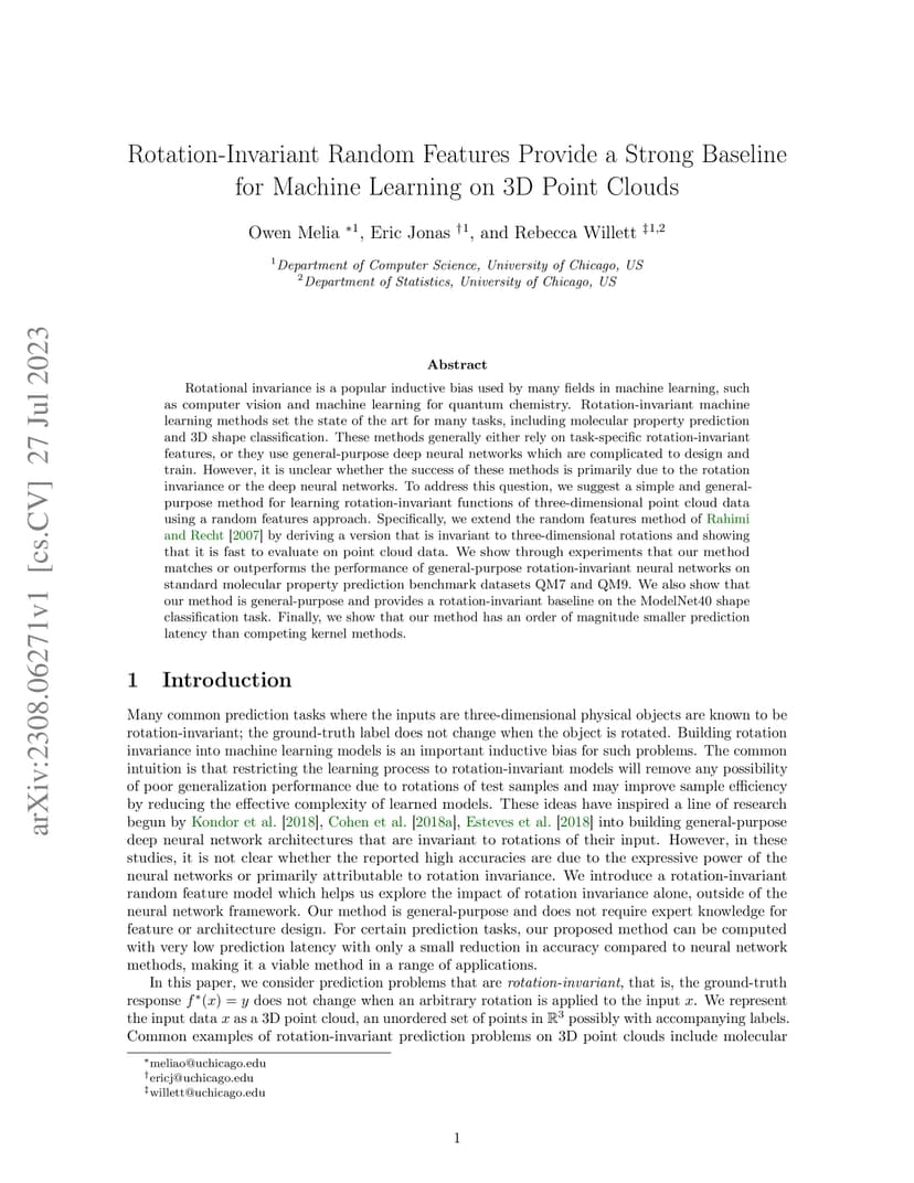 Rotational invariance is a popular inductive bias used by many fields in machine learning, such as computer vision and machine learning for quantum chemistry. Rotation-invariant machine learning methods set the state of the art for many tasks, including molecular property prediction and 3D shape classification. These methods generally either rely on task-specific rotation-invariant features, or they use general-purpose deep neural networks which are complicated to design and train. However, it is unclear whether the success of these methods is primarily due to the rotation invariance or the deep neural networks. To address this question, we suggest a simple and general-purpose method for learning rotation-invariant functions of three-dimensional point cloud data using a random features approach. Specifically, we extend the random features method of Rahimi & Recht 2007 by deriving a version that is invariant to three-dimensional rotations and showing that it is fast to evaluate on point cloud data. We show through experiments that our method matches or outperforms the performance of general-purpose rotation-invariant neural networks on standard molecular property prediction benchmark datasets QM7 and QM9. We also show that our method is general-purpose and provides a rotation-invariant baseline on the ModelNet40 shape classification task. Finally, we show that our method has an order of magnitude smaller prediction latency than competing kernel methods.