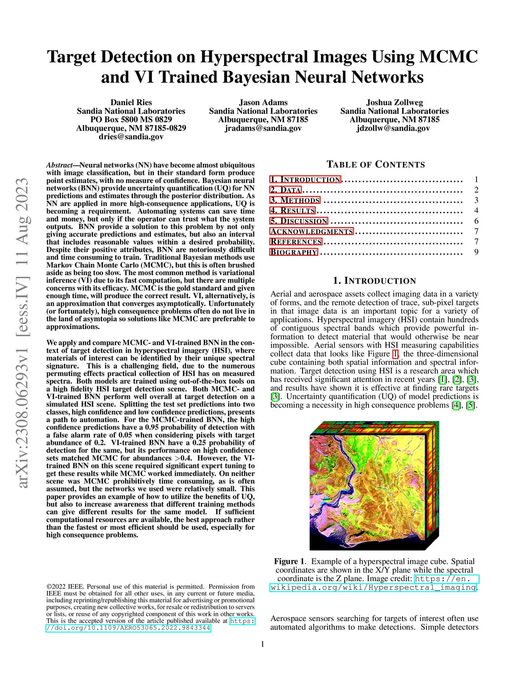 Neural networks (NN) have become almost ubiquitous with image classification, but in their standard form produce point estimates, with no measure of confidence. Bayesian neural networks (BNN) provide uncertainty quantification (UQ) for NN predictions and estimates through the posterior distribution. As NN are applied in more high-consequence applications, UQ is becoming a requirement. BNN provide a solution to this problem by not only giving accurate predictions and estimates, but also an interval that includes reasonable values within a desired probability. Despite their positive attributes, BNN are notoriously difficult and time consuming to train. Traditional Bayesian methods use Markov Chain Monte Carlo (MCMC), but this is often brushed aside as being too slow. The most common method is variational inference (VI) due to its fast computation, but there are multiple concerns with its efficacy. We apply and compare MCMC- and VI-trained BNN in the context of target detection in hyperspectral imagery (HSI), where materials of interest can be identified by their unique spectral signature. This is a challenging field, due to the numerous permuting effects practical collection of HSI has on measured spectra. Both models are trained using out-of-the-box tools on a high fidelity HSI target detection scene. Both MCMC- and VI-trained BNN perform well overall at target detection on a simulated HSI scene. This paper provides an example of how to utilize the benefits of UQ, but also to increase awareness that different training methods can give different results for the same model. If sufficient computational resources are available, the best approach rather than the fastest or most efficient should be used, especially for high consequence problems.