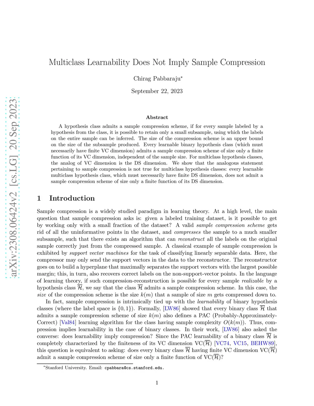 A hypothesis class admits a sample compression scheme, if for every sample labeled by a hypothesis from the class, it is possible to retain only a small subsample, using which the labels on the entire sample can be inferred. The size of the compression scheme is an upper bound on the size of the subsample produced. Every learnable binary hypothesis class (which must necessarily have finite VC dimension) admits a sample compression scheme of size only a finite function of its VC dimension, independent of the sample size. For multiclass hypothesis classes, the analog of VC dimension is the DS dimension. We show that the analogous statement pertaining to sample compression is not true for multiclass hypothesis classes: every learnable multiclass hypothesis class, which must necessarily have finite DS dimension, does not admit a sample compression scheme of size only a finite function of its DS dimension.