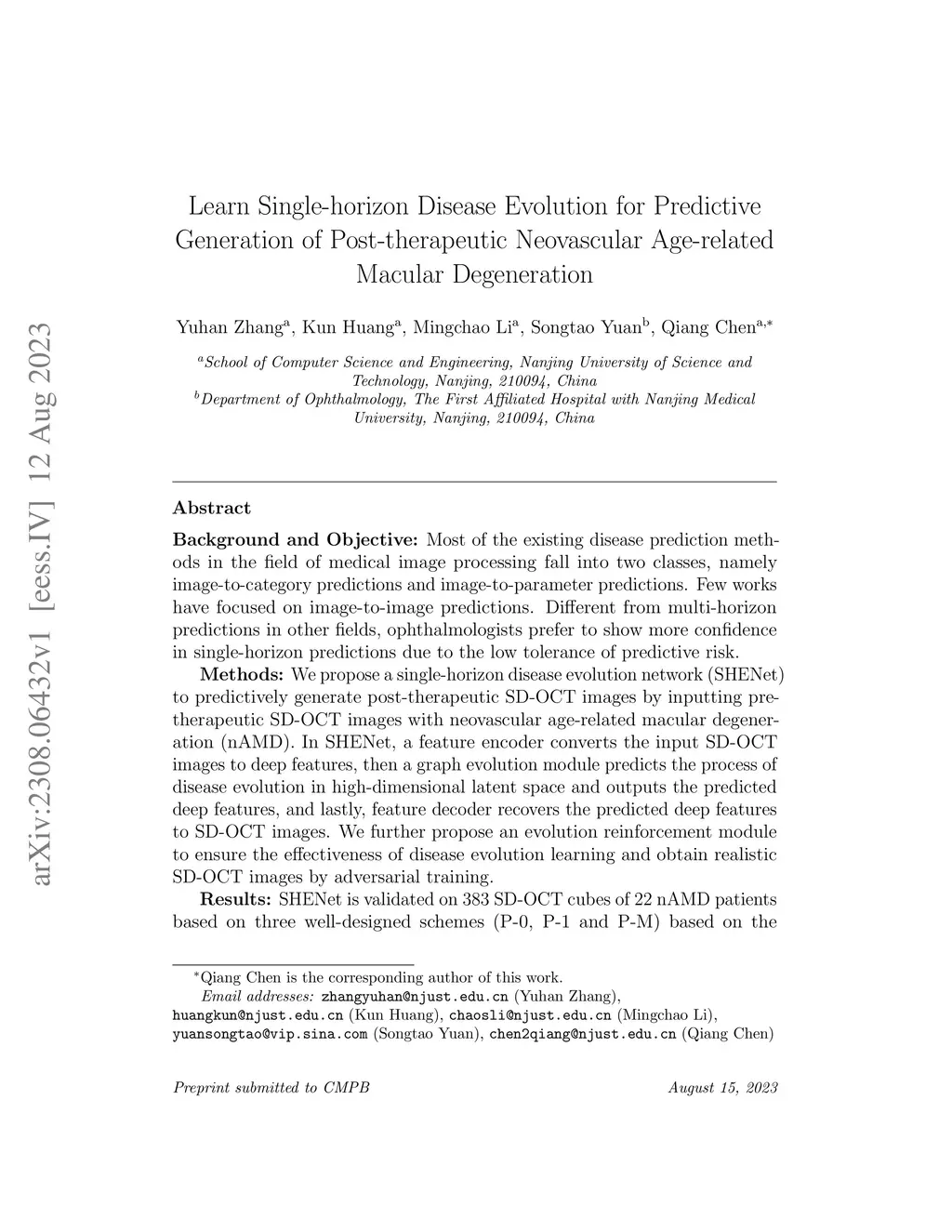 Most of the existing disease prediction methods in the field of medical image processing fall into two classes, namely image-to-category predictions and image-to-parameter predictions. Few works have focused on image-to-image predictions. Different from multi-horizon predictions in other fields, ophthalmologists prefer to show more confidence in single-horizon predictions due to the low tolerance of predictive risk. We propose a single-horizon disease evolution network (SHENet) to predictively generate post-therapeutic SD-OCT images by inputting pre-therapeutic SD-OCT images with neovascular age-related macular degeneration (nAMD). In SHENet, a feature encoder converts the input SD-OCT images to deep features, then a graph evolution module predicts the process of disease evolution in high-dimensional latent space and outputs the predicted deep features, and lastly, feature decoder recovers the predicted deep features to SD-OCT images. We further propose an evolution reinforcement module to ensure the effectiveness of disease evolution learning and obtain realistic SD-OCT images by adversarial training. SHENet is validated on 383 SD-OCT cubes of 22 nAMD patients based on three well-designed schemes based on the quantitative and qualitative evaluations. Compared with other generative methods, the generative SD-OCT images of SHENet have the highest image quality. Besides, SHENet achieves the best structure protection and content prediction. Qualitative evaluations also demonstrate that SHENet has a better visual effect than other methods. SHENet can generate post-therapeutic SD-OCT images with both high prediction performance and good image quality, which has great potential to help ophthalmologists forecast the therapeutic effect of nAMD.
