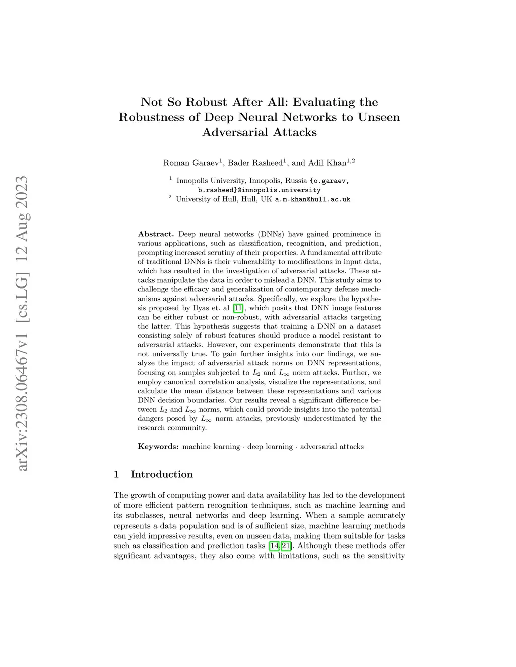 Deep neural networks (DNNs) have gained prominence in various applications, such as classification, recognition, and prediction, prompting increased scrutiny of their properties. A fundamental attribute of traditional DNNs is their vulnerability to modifications in input data, which has resulted in the investigation of adversarial attacks. These attacks manipulate the data in order to mislead a DNN. This study aims to challenge the efficacy and generalization of contemporary defense mechanisms against adversarial attacks. Specifically, we explore the hypothesis proposed by Ilyas et. al, which posits that DNN image features can be either robust or non-robust, with adversarial attacks targeting the latter. This hypothesis suggests that training a DNN on a dataset consisting solely of robust features should produce a model resistant to adversarial attacks. However, our experiments demonstrate that this is not universally true. To gain further insights into our findings, we analyze the impact of adversarial attack norms on DNN representations, focusing on samples subjected to and norm attacks. Further, we employ canonical correlation analysis, visualize the representations, and calculate the mean distance between these representations and various DNN decision boundaries. Our results reveal a significant difference between and norms, which could provide insights into the potential dangers posed by norm attacks, previously underestimated by the research community.