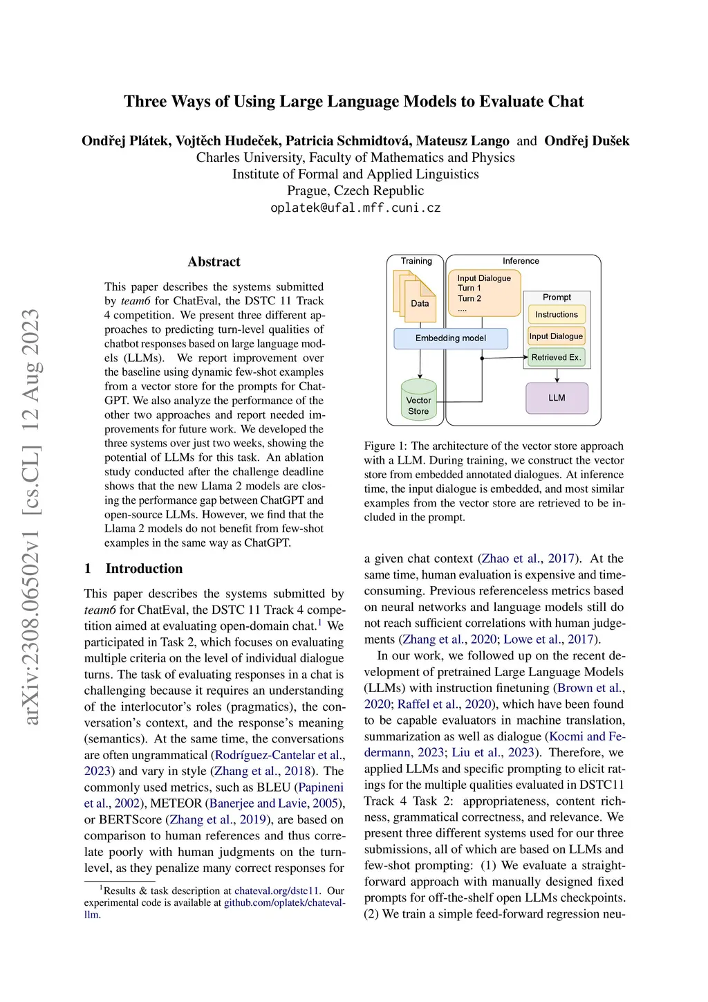 This paper describes the systems submitted by team6 for ChatEval, the DSTC 11 Track 4 competition. We present three different approaches to predicting turn-level qualities of chatbot responses based on large language models (LLMs). We report improvement over the baseline using dynamic few-shot examples from a vector store for the prompts for ChatGPT. We also analyze the performance of the other two approaches and report needed improvements for future work. We developed the three systems over just two weeks, showing the potential of LLMs for this task. An ablation study conducted after the challenge deadline shows that the new Llama 2 models are closing the performance gap between ChatGPT and open-source LLMs. However, we find that the Llama 2 models do not benefit from few-shot examples in the same way as ChatGPT.
