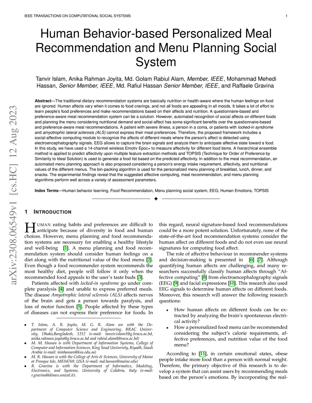 The traditional dietary recommendation systems are basically nutrition or health-aware where the human feelings on food are ignored. Human affects vary when it comes to food cravings, and not all foods are appealing in all moods. A questionnaire-based and preference-aware meal recommendation system can be a solution. However, automated recognition of social affects on different foods and planning the menu considering nutritional demand and social-affect has some significant benefits of the questionnaire-based and preference-aware meal recommendations. A patient with severe illness, a person in a coma, or patients with locked-in syndrome and amyotrophic lateral sclerosis (ALS) cannot express their meal preferences. Therefore, the proposed framework includes a social-affective computing module to recognize the affects of different meals where the person's affect is detected using electroencephalography signals. EEG allows to capture the brain signals and analyze them to anticipate affective toward a food. In this study, we have used a 14-channel wireless Emotive Epoc+ to measure affectivity for different food items. A hierarchical ensemble method is applied to predict affectivity upon multiple feature extraction methods and TOPSIS (Technique for Order of Preference by Similarity to Ideal Solution) is used to generate a food list based on the predicted affectivity. In addition to the meal recommendation, an automated menu planning approach is also proposed considering a person's energy intake requirement, affectivity, and nutritional values of the different menus. The bin-packing algorithm is used for the personalized menu planning of breakfast, lunch, dinner, and snacks. The experimental findings reveal that the suggested affective computing, meal recommendation, and menu planning algorithms perform well across a variety of assessment parameters.
