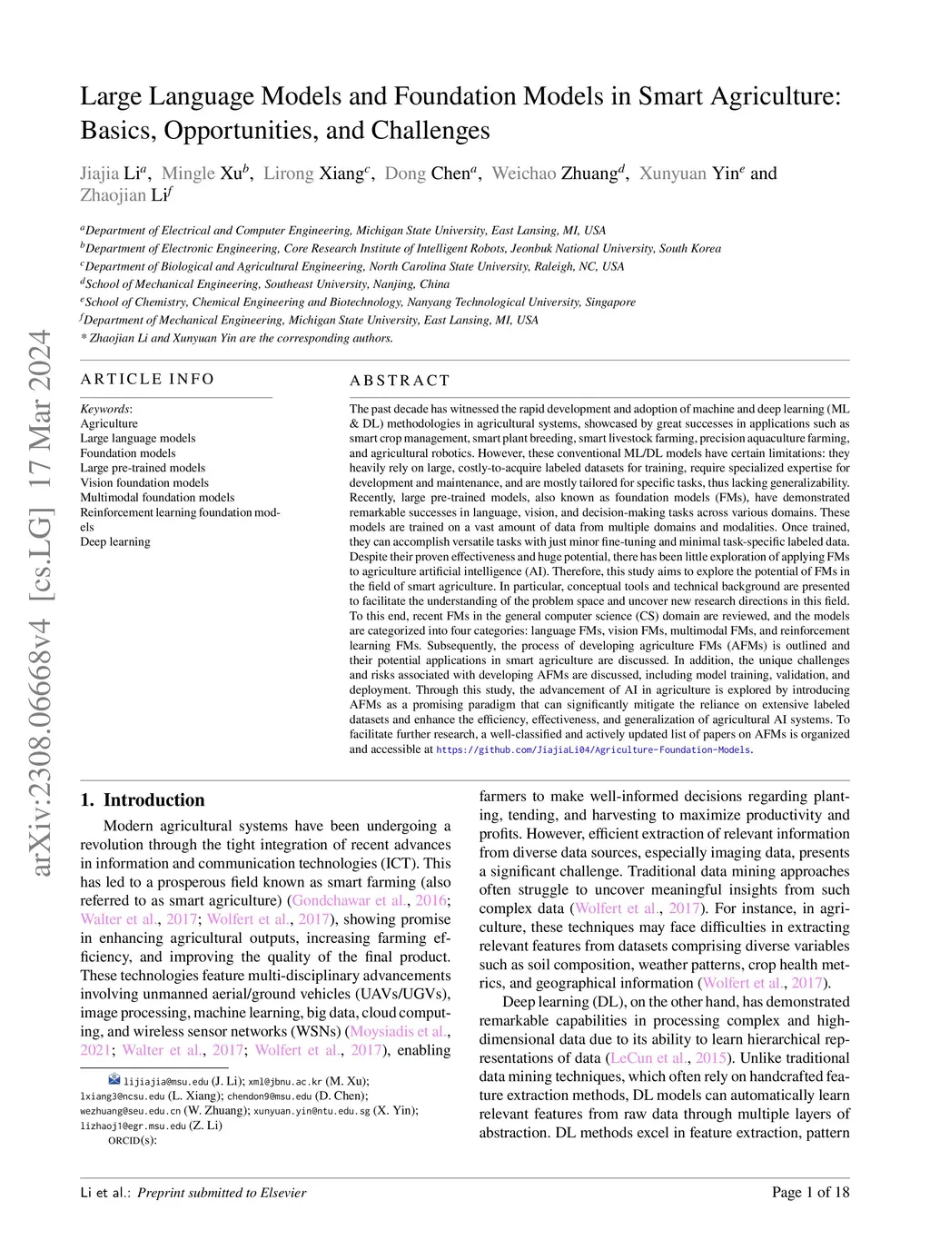 The past decade has witnessed the rapid development and adoption of ML & DL methodologies in agricultural systems, showcased by great successes in agricultural applications. However, these conventional ML/DL models have certain limitations: they heavily rely on large, costly-to-acquire labeled datasets for training, require specialized expertise for development and maintenance, and are mostly tailored for specific tasks, thus lacking generalizability. Recently, large pre-trained models, also known as FMs, have demonstrated remarkable successes in language, vision, and decision-making tasks across various domains. These models are trained on a large amount of data from multiple domains and modalities. Once trained, they can accomplish versatile tasks with just minor fine-tuning and minimal task-specific labeled data. Despite their proven effectiveness and huge potential, there has been little exploration of applying FMs to agriculture AI. Thus, this study aims to explore the potential of FMs in the field of smart agriculture. In particular, conceptual tools and technical background are presented to help the understanding of the problem space and uncover new research directions. To this end, recent FMs in the general CS domain are reviewed, and the models are categorized into four categories: language FMs, vision FMs, multimodal FMs, and reinforcement learning FMs. Then, the steps of developing agriculture FMs (AFMs) are outlined and potential applications in smart agriculture are discussed. Moreover, challenges and risks associated with developing AFMs are discussed, including model training, validation, and deployment. In summary, the advancement of AI in agriculture is explored by introducing AFMs as a promising paradigm that can significantly mitigate the reliance on extensive labeled datasets and enhance the efficiency, effectiveness, and generalization of agricultural AI systems.
