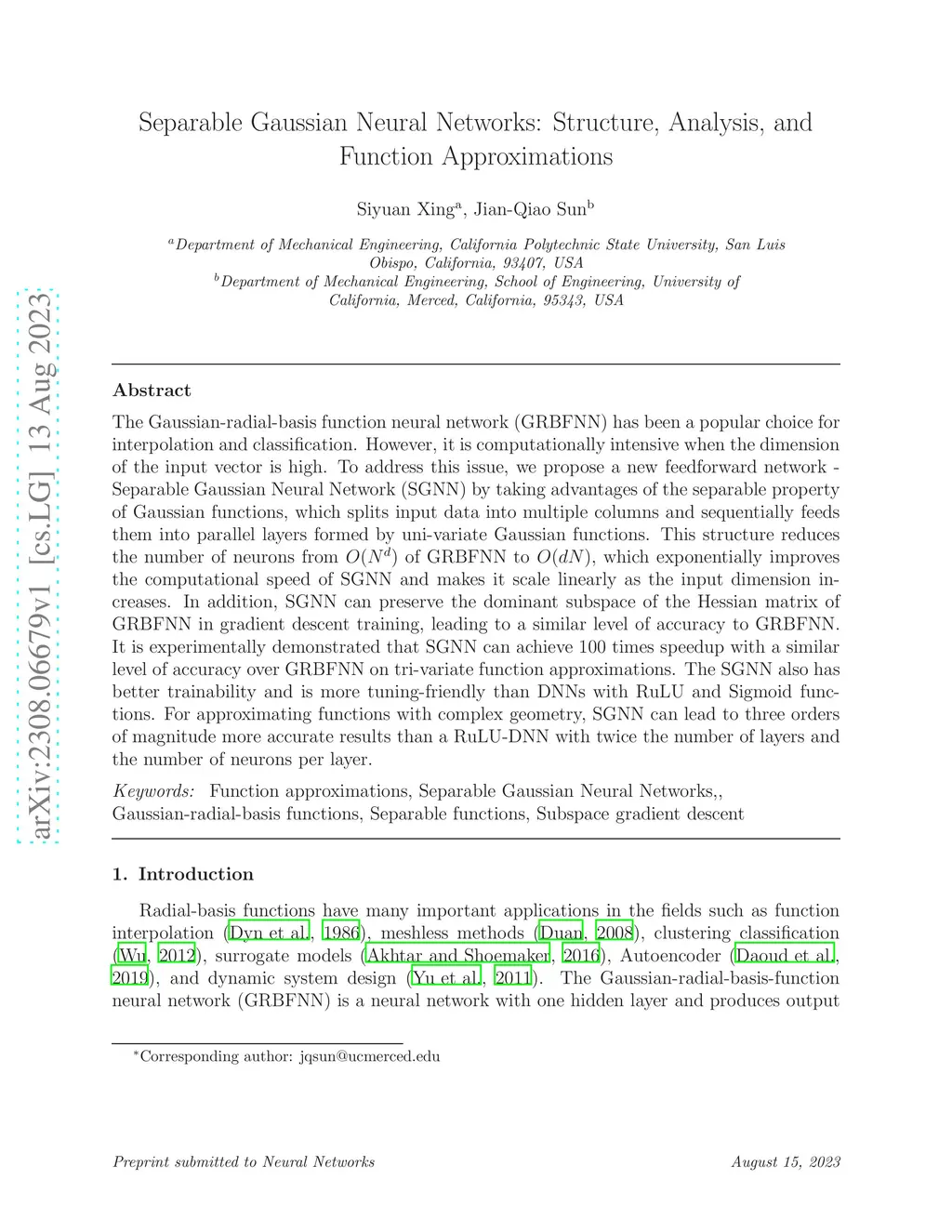 The Gaussian-radial-basis function neural network (GRBFNN) has been a popular choice for interpolation and classification. However, it is computationally intensive when the dimension of the input vector is high. To address this issue, we propose a new feedforward network - Separable Gaussian Neural Network (SGNN) by taking advantage of the separable property of Gaussian functions, which splits input data into multiple columns and sequentially feeds them into parallel layers formed by uni-variate Gaussian functions. This structure reduces the number of neurons from O(N^d) of GRBFNN to O(dN), which exponentially improves the computational speed of SGNN and makes it scale linearly as the input dimension increases. In addition, SGNN can preserve the dominant subspace of the Hessian matrix of GRBFNN in gradient descent training, leading to a similar level of accuracy to GRBFNN. It is experimentally demonstrated that SGNN can achieve 100 times speedup with a similar level of accuracy over GRBFNN on tri-variate function approximations. The SGNN also has better trainability and is more tuning-friendly than DNNs with RuLU and Sigmoid functions. For approximating functions with complex geometry, SGNN can lead to three orders of magnitude more accurate results than a RuLU-DNN with twice the number of layers and the number of neurons per layer.