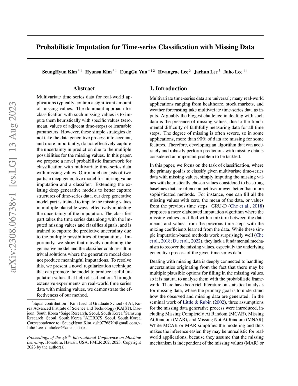Multivariate time series data for real-world applications typically contain a significant amount of missing values. The dominant approach for classification with such missing values is to impute them heuristically with specific values (zero, mean, values of adjacent time-steps) or learnable parameters. However, these simple strategies do not take the data generative process into account, and more importantly, do not effectively capture the uncertainty in prediction due to the multiple possibilities for the missing values. In this paper, we propose a novel probabilistic framework for classification with multivariate time series data with missing values. Our model consists of two parts; a deep generative model for missing value imputation and a classifier. Extending the existing deep generative models to better capture structures of time-series data, our deep generative model part is trained to impute the missing values in multiple plausible ways, effectively modeling the uncertainty of the imputation. The classifier part takes the time series data along with the imputed missing values and classifies signals, and is trained to capture the predictive uncertainty due to the multiple possibilities of imputations. Importantly, we show that na\"ively combining the generative model and the classifier could result in trivial solutions where the generative model does not produce meaningful imputations. To resolve this, we present a novel regularization technique that can promote the model to produce useful imputation values that help classification. Through extensive experiments on real-world time series data with missing values, we demonstrate the effectiveness of our method.
