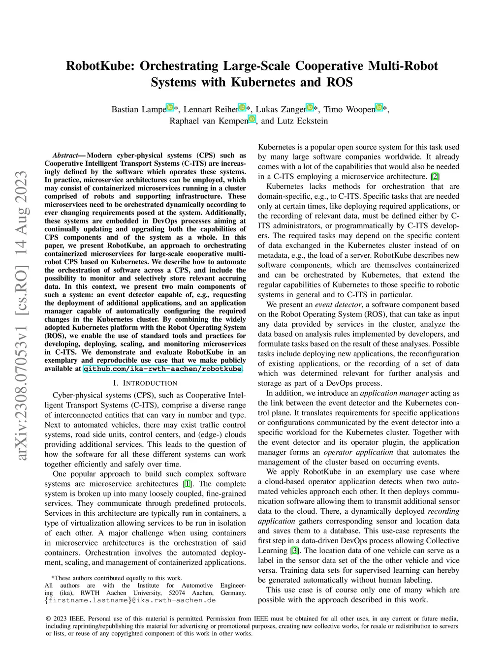 Modern cyber-physical systems (CPS) such as Cooperative Intelligent Transport Systems (C-ITS) are increasingly defined by the software which operates these systems. In practice, microservice architectures can be employed, which may consist of containerized microservices running in a cluster comprised of robots and supporting infrastructure. These microservices need to be orchestrated dynamically according to ever changing requirements posed at the system. Additionally, these systems are embedded in DevOps processes aiming at continually updating and upgrading both the capabilities of CPS components and of the system as a whole. In this paper, we present RobotKube, an approach to orchestrating containerized microservices for large-scale cooperative multi-robot CPS based on Kubernetes. We describe how to automate the orchestration of software across a CPS, and include the possibility to monitor and selectively store relevant accruing data. In this context, we present two main components of such a system: an event detector capable of, e.g., requesting the deployment of additional applications, and an application manager capable of automatically configuring the required changes in the Kubernetes cluster. By combining the widely adopted Kubernetes platform with the Robot Operating System (ROS), we enable the use of standard tools and practices for developing, deploying, scaling, and monitoring microservices in C-ITS. We demonstrate and evaluate RobotKube in an exemplary and reproducible use case that we make publicly available at https://github.com/ika-rwth-aachen/robotkube .