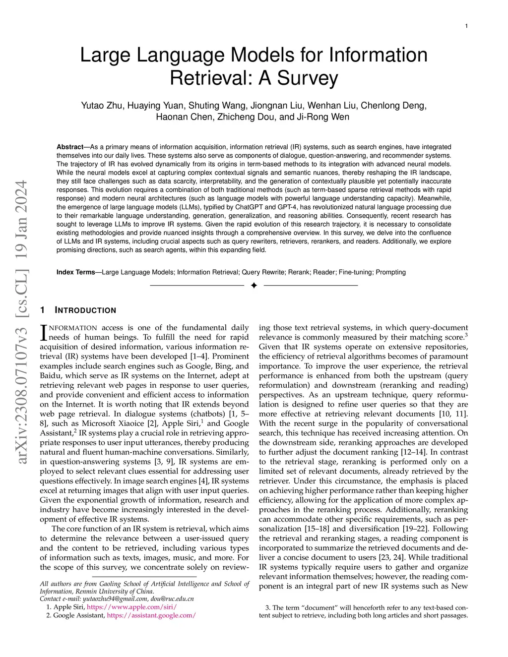 As a primary means of information acquisition, information retrieval (IR) systems, such as search engines, have integrated themselves into our daily lives. These systems also serve as components of dialogue, question-answering, and recommender systems. The trajectory of IR has evolved dynamically from its origins in term-based methods to its integration with advanced neural models. While the neural models excel at capturing complex contextual signals and semantic nuances, thereby reshaping the IR landscape, they still face challenges such as data scarcity, interpretability, and the generation of contextually plausible yet potentially inaccurate responses. This evolution requires a combination of both traditional methods (such as term-based sparse retrieval methods with rapid response) and modern neural architectures (such as language models with powerful language understanding capacity). Meanwhile, the emergence of large language models (LLMs), typified by ChatGPT and GPT-4, has revolutionized natural language processing due to their remarkable language understanding, generation, generalization, and reasoning abilities. Consequently, recent research has sought to leverage LLMs to improve IR systems. Given the rapid evolution of this research trajectory, it is necessary to consolidate existing methodologies and provide nuanced insights through a comprehensive overview. In this survey, we delve into the confluence of LLMs and IR systems, including crucial aspects such as query rewriters, retrievers, rerankers, and readers. Additionally, we explore promising directions, such as search agents, within this expanding field.