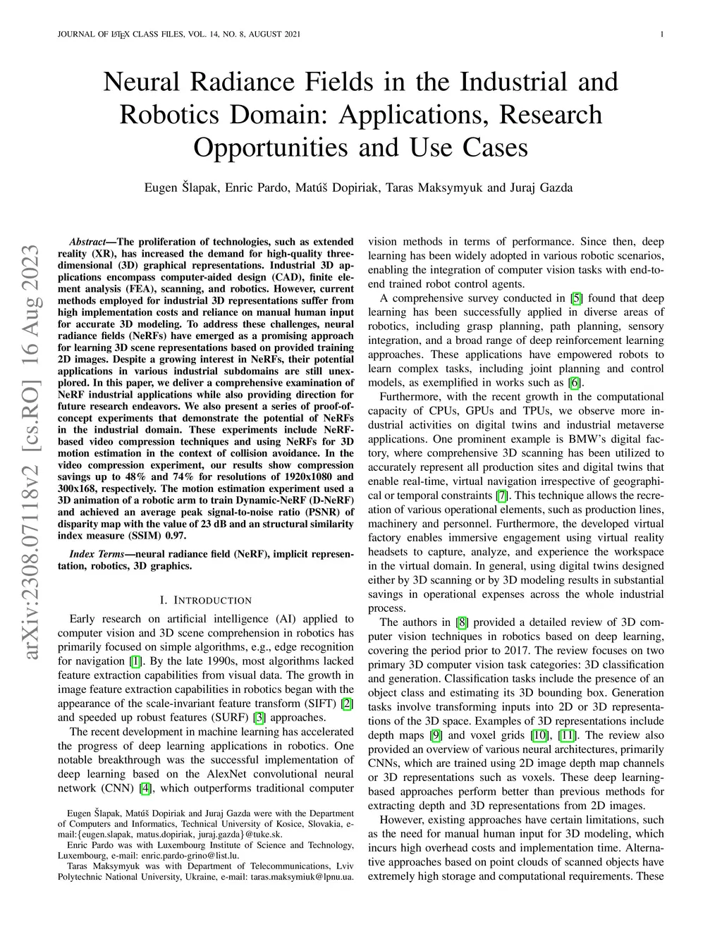 The proliferation of technologies, such as extended reality (XR), has increased the demand for high-quality three-dimensional (3D) graphical representations. Industrial 3D applications encompass computer-aided design (CAD), finite element analysis (FEA), scanning, and robotics. However, current methods employed for industrial 3D representations suffer from high implementation costs and reliance on manual human input for accurate 3D modeling. To address these challenges, neural radiance fields (NeRFs) have emerged as a promising approach for learning 3D scene representations based on provided training 2D images. Despite a growing interest in NeRFs, their potential applications in various industrial subdomains are still unexplored. In this paper, we deliver a comprehensive examination of NeRF industrial applications while also providing direction for future research endeavors. We also present a series of proof-of-concept experiments that demonstrate the potential of NeRFs in the industrial domain. These experiments include NeRF-based video compression techniques and using NeRFs for 3D motion estimation in the context of collision avoidance. In the video compression experiment, our results show compression savings up to 48\% and 74\% for resolutions of 1920x1080 and 300x168, respectively. The motion estimation experiment used a 3D animation of a robotic arm to train Dynamic-NeRF (D-NeRF) and achieved an average peak signal-to-noise ratio (PSNR) of disparity map with the value of 23 dB and an structural similarity index measure (SSIM) 0.97.