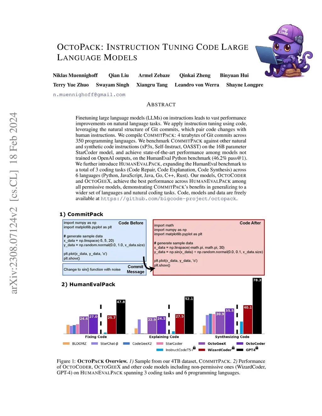 Finetuning large language models (LLMs) on instructions leads to vast performance improvements on natural language tasks. We apply instruction tuning using code, leveraging the natural structure of Git commits, which pair code changes with human instructions. We compile CommitPack: 4 terabytes of Git commits across 350 programming languages. We benchmark CommitPack against other natural and synthetic code instructions (xP3x, Self-Instruct, OASST) on the 16B parameter StarCoder model, and achieve state-of-the-art performance among models not trained on OpenAI outputs, on the HumanEval Python benchmark (46.2% pass@1). We further introduce HumanEvalPack, expanding the HumanEval benchmark to a total of 3 coding tasks (Code Repair, Code Explanation, Code Synthesis) across 6 languages (Python, JavaScript, Java, Go, C++, Rust). Our models, OctoCoder and OctoGeeX, achieve the best performance across HumanEvalPack among all permissive models, demonstrating CommitPack's benefits in generalizing to a wider set of languages and natural coding tasks. Code, models and data are freely available at https://github.com/bigcode-project/octopack.