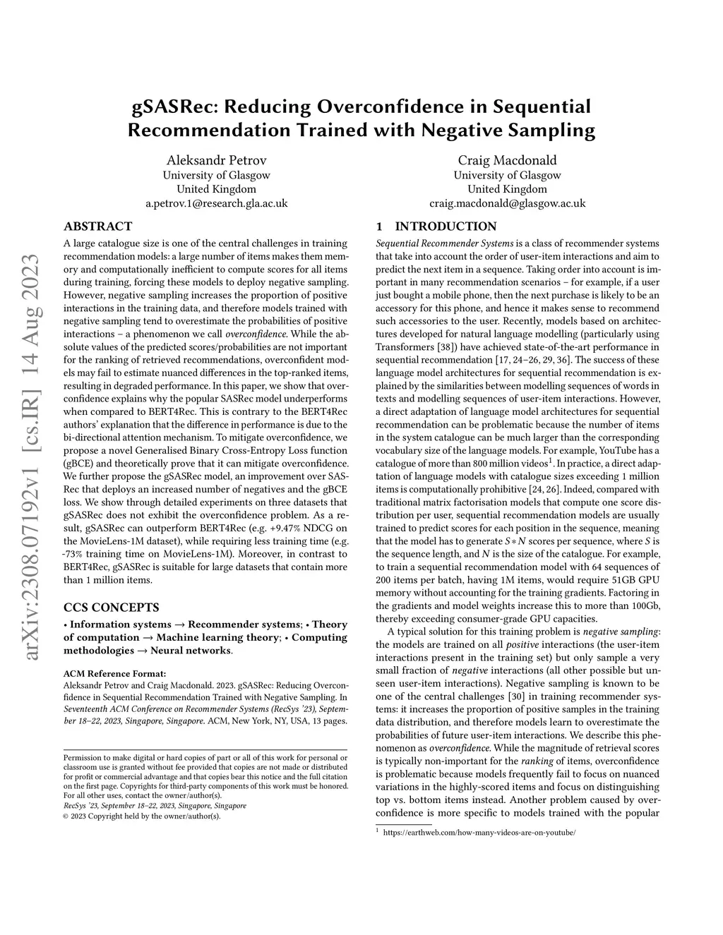 A large catalogue size is one of the central challenges in training recommendation models: a large number of items makes them memory and computationally inefficient to compute scores for all items during training, forcing these models to deploy negative sampling. However, negative sampling increases the proportion of positive interactions in the training data, and therefore models trained with negative sampling tend to overestimate the probabilities of positive interactions a phenomenon we call overconfidence. While the absolute values of the predicted scores or probabilities are not important for the ranking of retrieved recommendations, overconfident models may fail to estimate nuanced differences in the top-ranked items, resulting in degraded performance. In this paper, we show that overconfidence explains why the popular SASRec model underperforms when compared to BERT4Rec. This is contrary to the BERT4Rec authors explanation that the difference in performance is due to the bi-directional attention mechanism. To mitigate overconfidence, we propose a novel Generalised Binary Cross-Entropy Loss function (gBCE) and theoretically prove that it can mitigate overconfidence. We further propose the gSASRec model, an improvement over SASRec that deploys an increased number of negatives and the gBCE loss. We show through detailed experiments on three datasets that gSASRec does not exhibit the overconfidence problem. As a result, gSASRec can outperform BERT4Rec (e.g. +9.47% NDCG on the MovieLens-1M dataset), while requiring less training time (e.g. -73% training time on MovieLens-1M). Moreover, in contrast to BERT4Rec, gSASRec is suitable for large datasets that contain more than 1 million items.